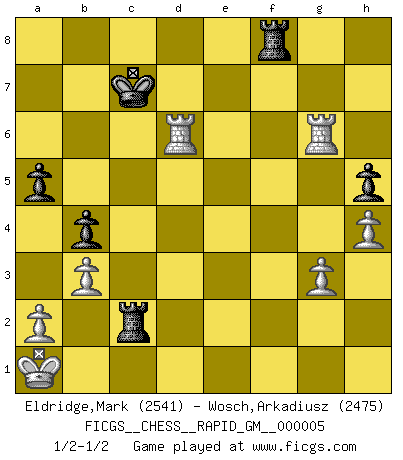 Last move : 1/2-1/2 2020 August 21 22:24:31 [Event "FICGS__CHESS__RAPID_GM__000005"] [Site "FICGS"] [Date "2020.05.02"] [Round "1"] [White "Eldridge,Mark"] [Black "Wosch,Arkadiusz"] [Result "1/2-1/2"] [WhiteElo "2541"] [BlackElo "2475"] 1.e4 c5 2.Nf3 Nc6 3.d4 cxd4 4.Nxd4 Nf6 5.Nc3 d6 6.Bg5 e6 7.Qd2 a6 8.O-O-O Bd7 9.f4 b5 10.Bxf6 gxf6 11.Kb1 Qb6 12.Nce2 Rc8 13.Nxc6 Bxc6 14.Ng3 h5 15.h4 b4 16.f5 a5 17.fxe6 fxe6 18.Bc4 Bd7 19.b3 Qc5 20.e5 Qxe5 21.Qf2 Be7 22.Rhe1 Qc5 23.Qf3 Kd8 24.Ne4 Qc6 25.Bxe6 Bxe6 26.Nxd6 Bxd6 27.Rxe6 Qxc2+ 28.Ka1 Qc3+ 29.Qxc3 Rxc3 30.R1xd6+ Kc7 31.Rxf6 Rc2 32.g3 Rg8 33.Rg6 Rf8 1/2-1/2 Sicilian defense Queenside Castling by player White (move 8) This chess game ended in a draw. Follow this game move after move (download)One of these modest little moves may be more embarrassing to your opponent than the biggest threat. (Siegbert Tarrasch) Wie ich sie so einen nach dem anderen nieder mähte wurde meine Überlegenheit offensichtlich. (José Raúl Capablanca) Un mal plan es mejor que no tener ningún plan. (Frank Marshall) Il vaut mieux sacrifier les pièces de l'adversaire. (Xavier Tartacover) Be who you are, and say what you feel because those who mind don't matter, and those who matter don't mind. (Dr Seuss)