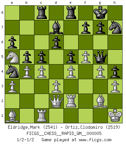 Last move : 1/2-1/2 2020 June 7 22:32:42 [Event "FICGS__CHESS__RAPID_GM__000005"] [Site "FICGS"] [Date "2020.05.02"] [Round "1"] [White "Eldridge,Mark"] [Black "Ortiz,Clodomiro"] [Result "1/2-1/2"] [WhiteElo "2541"] [BlackElo "2519"] 1.Nf3 Nf6 2.c4 e6 3.Nc3 Bb4 4.Qc2 O-O 5.a3 Bxc3 6.Qxc3 d6 7.b4 Re8 8.g3 b6 9.Bg2 Bb7 10.Bb2 c5 11.O-O Nbd7 12.d3 a6 13.Rfe1 b5 14.e4 Rc8 15.Nd2 e5 16.Rac1 Nb6 17.Ba1 Bc6 18.Nb3 Bd7 19.Na5 Na4 20.Qd2 h5 21.h3 h4 22.g4 Nh7 23.f4 Nf8 24.f5 Nh7 25.Bf3 Bc6 26.Re2 Qf6 27.Bg2 Bd7 28.Kh1 Qg5 1/2-1/2 Reti Opening Kingside Castling by player Black (move 4) Kingside Castling by player White (move 11) This chess game ended in a draw. Follow this game move after move (download)White lost because he failed to remember the right continuation and had to think up the moves himself. (Siegbert Tarrasch) Es genügt nicht ein guter Spieler zu sein, man muß auch gut spielen. (Siegbert Tarrasch) La mitad de las variaciones que son calculadas en una partida de torneo, resultan ser completamente superfluas. Desafortunadamente, nadie sabe por adelantado cual mitad. (Jan Tinman) Même si vous avez un bon coup à faire, regardez toujours s'il n'y en a pas un qui lui soit préférable. (Pedro Damiano) Panic is a sudden desertion of us, an a going over to the enemy of our imagination. (Christian Nevell Bovee)