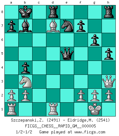 Last move : 1/2-1/2 2020 May 20 0:33:15 [Event "FICGS__CHESS__RAPID_GM__000005"] [Site "FICGS"] [Date "2020.05.02"] [Round "1"] [White "Szczepanski,Zbigniew"] [Black "Eldridge,Mark"] [Result "1/2-1/2"] [WhiteElo "2491"] [BlackElo "2541"] 1.d4 Nf6 2.c4 e6 3.Nf3 d5 4.Nc3 c6 5.e3 Nbd7 6.Bd3 dxc4 7.Bxc4 b5 8.Bd3 Bb7 9.e4 b4 10.Na4 c5 11.e5 Nd5 12.O-O cxd4 13.Nxd4 g6 14.Qg4 h5 15.Qh3 Qa5 16.Bg5 Qxa4 17.Qxe6+ Be7 18.Qh3 O-O-O 19.Bxe7 Nxe7 20.Bb5 Qa5 21.Rfd1 Kb8 22.Bxd7 Qxe5 23.Nb3 1/2-1/2 Queen's pawn game Kingside Castling by player White (move 12) Queenside Castling by player Black (move 18) This chess game ended in a draw. Follow this game move after move (download)To avoid losing a piece, many a person has lost the game. (Savielly Tartakover) Schach ist das Spiel, das die Verrückten gesund hält. (Albert Einstein) El Ajedrez es un juego de pelea el cual es puramente intelectual e incluye la suerte. (Richard Reti) Horreur, mais aussi harmonie suprême : qu'y avait-il en effet au monde en dehors des échecs ? Le brouillard, l'inconnu, le non-être... (Vladimir Nabokov) The Movers & Shakers of this world are those who play chess in the mornings and go to the disco in the evenings. (Dinesh De Silva)