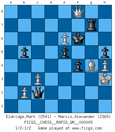 Last move : 1/2-1/2 2020 July 10 0:40:1 [Event "FICGS__CHESS__RAPID_GM__000005"] [Site "FICGS"] [Date "2020.05.02"] [Round "1"] [White "Eldridge,Mark"] [Black "Marciz,Alexander"] [Result "1/2-1/2"] [WhiteElo "2541"] [BlackElo "2365"] 1.Nf3 c5 2.e4 Nc6 3.d4 cxd4 4.Nxd4 Nf6 5.Nc3 e5 6.Ndb5 d6 7.Nd5 Nxd5 8.exd5 Nb8 9.a4 Be7 10.Be2 O-O 11.O-O f5 12.f4 Nd7 13.fxe5 Nxe5 14.c3 g6 15.Be3 a6 16.Nd4 Bg5 17.Bf2 Qc7 18.Qb3 Bd7 19.Ne6 Bxe6 20.dxe6 Rae8 21.Rad1 Rf6 22.Bd4 Re7 23.Kh1 Rf8 24.Qd5 Bf6 25.Rf4 Bg5 26.Bxe5 dxe5 27.Rc4 Qb8 28.Rb4 Qc7 29.Rc4 Qb8 30.Rb4 Qc7 31.g4 Kg7 32.h4 Be3 33.Qd7 Rfe8 34.gxf5 gxf5 35.Qd3 Qc6+ 36.Kh2 f4 37.Bg4 Bc5 38.Rc4 b5 39.Re4 Rd8 40.axb5 axb5 41.Qxd8 Qxe4 42.Rd6 Bxd6 43.Qxd6 Qc2+ 44.Kh3 Kf6 45.Qd8 h5 46.Qh8+ Rg7 47.Qd8+ Re7 48.Qh8+ Rg7 49.Qf8+ Kg6 50.Qe8+ Kf6 51.Qf8+ Kg6 52.Qe8+ Kf6 53.Qf8+ 1/2-1/2 Reti Opening Kingside Castling by player Black (move 10) Kingside Castling by player White (move 11) This chess game ended in a draw. Follow this game move after move (download)My style is somewhere between that of Tal and Petrosian. (Reshevsky) Karpov ist ein Museumsstück. (Garry Kasparov) El hombre es un frívolo, una creatura engañosa y como un jugador de Ajedrez, se preocupa mas por el proceso de obtener su meta que de la meta por sí misma. (Dostoyevsky) Les ravages du H expliquent la différence de niveau entre Tal et Thal [Abergel]. Everybody lies. (Gregory House, House M.D.)