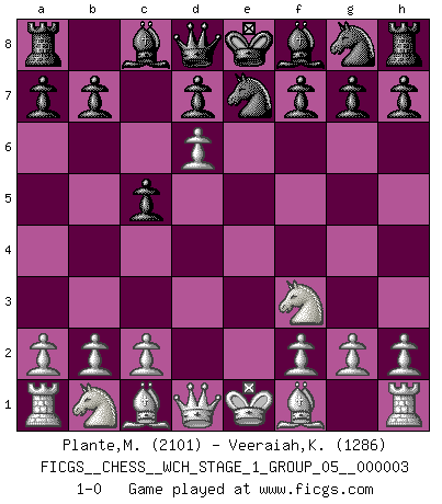Last move : 1-0 2007 July 25 6:10:5 [Event "FICGS__CHESS__WCH_STAGE_1_GROUP_05__000003"] [Site "FICGS"] [Date "2007.07.11"] [Round "1"] [White "Plante,Marc-Eric"] [Black "Veeraiah,Karuppaiah"] [Result "1-0"] [WhiteElo "2101"] [BlackElo "1286"] 1.e4 c5 2.Nf3 Nc6 3.d4 e6 4.d5 exd5 5.exd5 Nce7 6.d6 1-0 Sicilian defense Player White won this chess game. Follow this game move after move (download)Chess is a fighting game which is purely intellectual and includes chance. (Richard Reti) Im Leben werden Partien nie so unstrittig gewonnen wie im Spiel (Emanuel Lasker) De todos mis libros Rusos, la defensa contiene y difunde el 'calor' mas grande que pudiese verse extraño al observar lo supremamente abstracto que el Ajedrez supuestamente es. (Vladimir Nabokov) Un footballeur joue avec ses pieds, parfois avec sa tête. Un joueur d'échecs ne joue qu'avec sa tête. Et quand il ne joue plus, il meurt. (Jacob Murray) Faith : not wanting to know what is true. (Friedrich Nietzsche)
