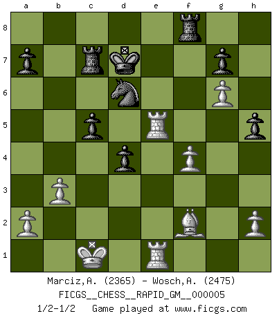 Last move : 1/2-1/2 2020 July 4 21:11:16 [Event "FICGS__CHESS__RAPID_GM__000005"] [Site "FICGS"] [Date "2020.05.02"] [Round "1"] [White "Marciz,Alexander"] [Black "Wosch,Arkadiusz"] [Result "1/2-1/2"] [WhiteElo "2365"] [BlackElo "2475"] 1.e4 c5 2.Nf3 Nc6 3.Nc3 e6 4.d4 cxd4 5.Nxd4 Nf6 6.Nxc6 bxc6 7.e5 Nd5 8.Ne4 Qc7 9.f4 Qb6 10.c4 Bb4+ 11.Ke2 f5 12.exf6 Nxf6 13.Be3 Qd8 14.Nd6+ Bxd6 15.Qxd6 Bb7 16.Rd1 Rc8 17.g4 c5 18.Rg1 Rf8 19.g5 Ne4 20.Qd3 Rc7 21.Re1 Qa8 22.Kd1 d5 23.Kc1 d4 24.Bg2 Nd6 25.Bxb7 Qxb7 26.g6 Qa6 27.Bf2 Qxc4+ 28.Qxc4 Nxc4 29.b3 Nd6 30.Rxe6+ Kd7 31.Re5 h5 32.Rge1 1/2-1/2 Sicilian defense This chess game ended in a draw. Follow this game move after move (download)Chess is a fairy tale of 1001 blunders. (Savielly Tartakower) Im Reiche der Wirklichkeit ist man nie so glücklich wie im Reiche der Gedanken. (Arthur Schopenhauer) Ayuda a tus piezas para que ellas te puedan ayudar. (Paul Morphy) Le thème de l'attaque double intervient d'une manière ou d'une autre dans l'immense majorité des combinaisons. (Youri Averbakh) All maxims have their antagonist maxims; proverbs should be sold in pairs, a single one being but a half truth. (William Mathews)