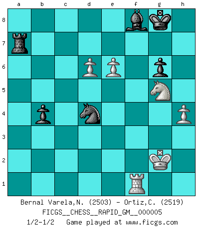 Last move : 1/2-1/2 2020 August 3 22:45:3 [Event "FICGS__CHESS__RAPID_GM__000005"] [Site "FICGS"] [Date "2020.05.02"] [Round "1"] [White "Bernal Varela,Nelson"] [Black "Ortiz,Clodomiro"] [Result "1/2-1/2"] [WhiteElo "2503"] [BlackElo "2519"] 1.c4 e5 2.g3 c6 3.d4 e4 4.a3 d5 5.Nc3 Be7 6.f3 Nf6 7.Bg2 exf3 8.Nxf3 O-O 9.O-O h6 10.Bf4 dxc4 11.e4 Be6 12.Be3 Re8 13.h3 Nbd7 14.Qe2 b5 15.Nh4 Nb6 16.Qf2 Rb8 17.Rad1 a5 18.Ne2 Bf8 19.Nf4 Rb7 20.Nxe6 Rxe6 21.e5 Nfd5 22.Be4 c3 23.Bc1 Nc4 24.Rd3 cxb2 25.Bxb2 Nxb2 26.Qxb2 g6 27.Ng2 R6e7 28.h4 h5 29.g4 b4 30.gxh5 Nc3 31.Bxc6 Rb6 32.hxg6 Rxc6 33.axb4 axb4 34.Nf4 Qc8 35.d5 Rc4 36.d6 Ra7 37.Qg2 Bg7 38.Qh3 Qxh3 39.Nxh3 Rd4 40.Rxd4 Ne2+ 41.Kg2 Nxd4 42.Ng5 fxg6 43.e6 Bf8 1/2-1/2 English Opening Kingside Castling by player Black (move 8) Kingside Castling by player White (move 9) This chess game ended in a draw. Follow this game move after move (download)I like to say that Bobby Fischer was the greatest player ever. But what made Fischer a genius was his ability to blend an American freshness and pragmatism with Russian ideas about strategy. (Bruce Pandolfini) Obwohl ich vom Stil her kaum zu den Priestern der Schachkunst gezählt werde, halte ich Schach doch für eine Kunst. (Tigran Petrosjan) Botvinnik trataba de restarle el misterio al Ajedrez, siempre relacionandolo a situaciones de la vida ordinaria. El gustaba de llamar al Ajedrez un típico problema inexacto similar a aquellos de los cuales la gente siempre tiene que enfrentarse en la vida cotidiana. (Garry Kasparov) Des idées, des idées, j'en ai cent, j'en ai mille. Des bonnes, des mauvaises, applicables, irréalisables... Il suffit de faire le tri ! (Roos) When you've done things right people won't know you've done anything at all. (Futurama)
