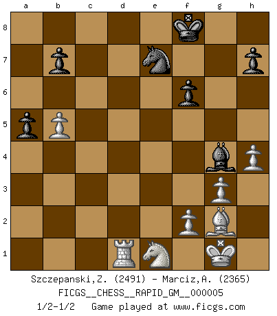 Last move : 1/2-1/2 2020 May 15 21:35:2 [Event "FICGS__CHESS__RAPID_GM__000005"] [Site "FICGS"] [Date "2020.05.02"] [Round "1"] [White "Szczepanski,Zbigniew"] [Black "Marciz,Alexander"] [Result "1/2-1/2"] [WhiteElo "2491"] [BlackElo "2365"] 1.d4 d5 2.c4 c6 3.cxd5 cxd5 4.Bf4 Nc6 5.Nc3 e5 6.Bxe5 Nxe5 7.dxe5 d4 8.Ne4 Bb4+ 9.Nd2 Ne7 10.a3 Ba5 11.g3 d3 12.Ngf3 O-O 13.b4 Bb6 14.Nc4 Bf5 15.exd3 a5 16.b5 Rc8 17.h4 f6 18.Nxb6 Qxb6 19.Bg2 Rfd8 20.Qb3+ Kf8 21.exf6 gxf6 22.O-O Rxd3 23.Qb2 R8c3 24.Qe2 Bg4 25.Rfe1 Qd6 26.Red1 Rxa3 27.Rxd3 Qxd3 28.Qxd3 Rxd3 29.Ne1 Rd1 30.Rxd1 1/2-1/2 QGD Slav defense : Exchange variation Kingside Castling by player Black (move 12) Kingside Castling by player White (move 22) This chess game ended in a draw. Follow this game move after move (download)During a Chess competition a Chessmaster should be a combination of a beast of prey and a monk. (Alexander Alekhine) Ich verachte Kasparow. (Viktor Kortschnoi) Cuando no sepas que mover, espera por una idea que se le venga a la la cabeza de tu oponente. Tenlo por seguro de que esa idea estará incorrecta. (Siegbert Tarrasch) Les sacrifices démontrent seulement que quelqu'un a gaffé. (Savielly Tartacover) The human is the only animal species whose members are able to talk themselves into difficulties that would not otherwise exist. (Wendell Johnson)