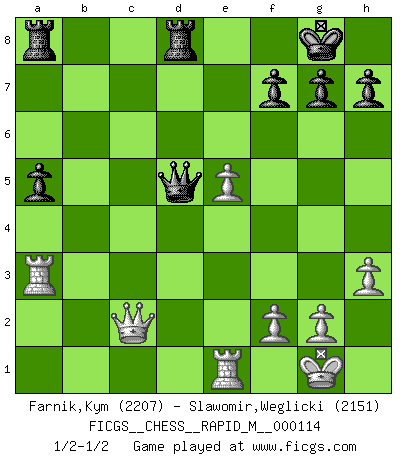 Last move : 1/2-1/2 2020 May 17 6:35:59 [Event "FICGS__CHESS__RAPID_M__000114"] [Site "FICGS"] [Date "2020.05.03"] [Round "1"] [White "Farnik,Kym"] [Black "Slawomir,Weglicki"] [Result "1/2-1/2"] [WhiteElo "2207"] [BlackElo "2151"] 1.d4 d5 2.Bf4 e6 3.Nf3 Nf6 4.e3 Bd6 5.Bb5+ c6 6.Bd3 Bxf4 7.exf4 Qd6 8.Qd2 b6 9.O-O c5 10.Nc3 a6 11.b3 O-O 12.Ne2 Nc6 13.Rfd1 Bb7 14.c3 a5 15.a4 Rfd8 16.Ng3 Ne7 17.Rab1 Ba6 18.Bxa6 Rxa6 19.Qd3 R6a8 20.Ne5 Nd7 21.Re1 Nxe5 22.dxe5 Qc6 23.f5 Nxf5 24.Nxf5 exf5 25.Qxf5 Qe6 26.Qc2 d4 27.Rbd1 c4 28.bxc4 Qxc4 29.Rd3 b5 30.axb5 dxc3 31.Rxc3 Qxb5 32.h3 Qd5 33.Ra3 1/2-1/2 Queen's pawn, Mason variation Kingside Castling by player White (move 9) Kingside Castling by player Black (move 11) This chess game ended in a draw. Follow this game move after move (download)The winner of the game is the player who makes the next-to-last mistake. (Savielly Tartakover) In der Schule lernt man nichts. Es ist nur Zeitverschwendung. (Robert James Fischer) Combinaciones deslumbrantes son para la mayoría, mover madera es para los pocos. (Georg Kieninger) Toutes choses étant égales, c'est la conviction qui gagne. Alliée à une volonté de vaincre, elle sert de détonateur, suscite des idées, disperse les doutes et aide à penser clairement. (Robert Fischer) Good luck. You're gonna need it. (Han Solo in Star Wars ep.6)