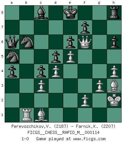 Last move : 1-0 2020 June 3 14:52:30 [Event "FICGS__CHESS__RAPID_M__000114"] [Site "FICGS"] [Date "2020.05.03"] [Round "1"] [White "Perevozchikov,Vjacheslav"] [Black "Farnik,Kym"] [Result "1-0"] [WhiteElo "2187"] [BlackElo "2207"] 1.Nf3 Nf6 2.g3 d5 3.Bg2 c5 4.O-O e6 5.d3 Nc6 6.Nbd2 Bd7 7.e4 h6 8.e5 Ng8 9.Re1 Nge7 10.c3 a5 11.Nb3 Nf5 12.a4 Rc8 13.Bd2 Qb6 14.h4 c4 15.Nc1 Qxb2 16.Ra2 Qb6 17.d4 Qd8 18.Ne2 Rb8 19.Nf4 b5 20.axb5 Rxb5 21.Nh5 Rb3 22.Bh3 Nfe7 23.Nh2 Qa8 24.Qg4 Kd8 25.Rea1 Qb8 26.Nf1 Qb5 27.Qd1 Nc8 28.Ne3 Nb6 29.Qf3 Rb2 30.Kh2 Rxa2 31.Rxa2 Ke8 32.Bc1 a4 33.Rb2 Qa6 34.Rb1 Na5 35.Ng4 Bc8 36.Nxg7+ Bxg7 37.Nf6+ Bxf6 38.Qxf6 1-0 Reti Opening Kingside Castling by player White (move 4) Player White won this chess game. Follow this game move after move (download)There's never before been a Chess player with such a thorough knowledge of the intricacies of the game and such an absolutely indomitable will to win. I think Bobby is the greatest player that ever lived. (Lisa Lane) Obendrein hat der FIDE-Präsident den Revolutionsführer Gaddafi zum »Großmeister« ernannt, am Ende der WM. Das ist lächerlich! (Joel Lautier) Dios mío, Bobby Fischer juega tan simple. (Alexei Suetin) Il n'y a plus de joueurs du niveau de Jacob Murray dont la seule quête est le beau jeu, le plaisir de voir les pièces construire quelque chose. Sur 10 idées à la minute, 9 seront sans intérêt, la dernière s'avèrera géniale. (Christian Bauer) Fortune favours the audacious. (Desiderius Erasmus)