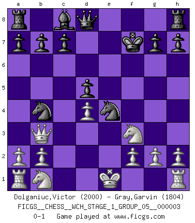 Last move : 0-1 2007 October 19 1:11:42 [Event "FICGS__CHESS__WCH_STAGE_1_GROUP_05__000003"] [Site "FICGS"] [Date "2007.07.11"] [Round "1"] [White "Dolganiuc,Victor"] [Black "Gray,Garvin"] [Result "0-1"] [WhiteElo "2000"] [BlackElo "1804"] 1.e4 e5 2.Nf3 Nc6 3.Bc4 Bc5 4.c3 Nf6 5.d4 exd4 6.cxd4 Bb4+ 7.Bd2 Nxe4 8.Bxb4 Nxb4 9.Bxf7+ Kxf7 10.Qb3+ d5 0-1 This chess game has been lost on time (started : 2007.07.11 16:54:55) Giuoco Piano Player Black won this chess game. Follow this game move after move (download)The older I grow, the more I value pawns. (Paul Keres) Die jungen Leute sollen verstehen, dass sie noch etwas von mir lernen können und müssen. (Viktor Kortschnoi) Aún deseo matar a Fischer. (Boris Spassky) Même si l'adversaire joue le coup analysé précédemment, recommencez l'analyse en voyant la nouvelle position. Première règle de Blumenfeld The hypothalamus is one of the most important parts of the brain, involved in many kinds of motivation, among other functions. The hypothalamus controls the 'Four Fs: Fighting, Fleeing, Feeding and Mating. (Unknown author)