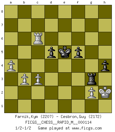 Last move : 1/2-1/2 2020 July 17 2:7:42 [Event "FICGS__CHESS__RAPID_M__000114"] [Site "FICGS"] [Date "2020.05.03"] [Round "1"] [White "Farnik,Kym"] [Black "Cesbron,Guy"] [Result "1/2-1/2"] [WhiteElo "2207"] [BlackElo "2172"] 1.d4 d5 2.Bf4 Nf6 3.Nf3 c5 4.e3 Nc6 5.Be2 Bf5 6.dxc5 e6 7.Nd4 Bxc5 8.Nxf5 exf5 9.c3 O-O 10.O-O h6 11.Nd2 g5 12.Bg3 Qe7 13.Nb3 Bb6 14.Bd3 Qe6 15.a4 a5 16.Nc1 Rfe8 17.Ra3 Ne5 18.Rb3 Nxd3 19.Nxd3 Ne4 20.Rb5 f6 21.Ne1 Rad8 22.Nc2 Rd7 23.Nd4 Bxd4 24.Qxd4 h5 25.h4 Nxg3 26.fxg3 Qxe3+ 27.Qxe3 Rxe3 28.hxg5 Rxg3 29.gxf6 Rg5 30.Re1 Kf7 31.Re7+ Rxe7 32.fxe7 h4 33.Kh2 b6 34.Rxb6 Rg4 35.b3 Kxe7 36.Rb5 Kd6 37.Rxa5 Rg3 38.Ra6+ Ke5 39.Rc6 1/2-1/2 Queen's pawn, Mason variation Kingside Castling by player Black (move 9) Kingside Castling by player White (move 10) This chess game ended in a draw. Follow this game move after move (download)Chess teaches you to control the initial excitement you feel when you see something that looks good and it trains you to think objectively when you're in trouble. (Stanley Kubrick) Um sich vor der Gefahr einer Erkältung zu schützen, sorge der wanderlustige König beizeiten für ein brauchbares Versteck. (Aaron Nimzowitsch) El hombre es un frívolo, una creatura engañosa y como un jugador de Ajedrez, se preocupa mas por el proceso de obtener su meta que de la meta por sí misma. (Dostoyevsky) Aucun coup ne doit être joué sans but. (Pedro Damiano) Mac users swear by their computers. PC users swear at their computers. (Author unknown)