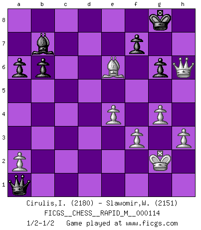 Last move : 1/2-1/2 2020 May 26 6:52:13 [Event "FICGS__CHESS__RAPID_M__000114"] [Site "FICGS"] [Date "2020.05.03"] [Round "1"] [White "Cirulis,Ilmars"] [Black "Slawomir,Weglicki"] [Result "1/2-1/2"] [WhiteElo "2180"] [BlackElo "2151"] 1.d4 Nf6 2.c4 g6 3.Nc3 d5 4.cxd5 Nxd5 5.e4 Nxc3 6.bxc3 Bg7 7.Bc4 c5 8.Ne2 Nc6 9.Be3 O-O 10.O-O b6 11.Qd2 Bb7 12.Rfd1 cxd4 13.cxd4 Rc8 14.Rac1 Na5 15.Bd3 e6 16.h3 Qd7 17.Bh6 Rxc1 18.Rxc1 Bxh6 19.Qxh6 Rc8 20.Rxc8+ Qxc8 21.Qe3 Qd8 22.g3 Qd6 23.f3 Qa3 24.Qd2 a6 25.Kg2 Nc6 26.g4 h6 27.Bc4 Qd6 28.Qxh6 Nxd4 29.Nxd4 Qxd4 30.Bxe6 Qb2+ 31.Kg1 Qa1+ 32.Kg2 Qb2+ 33.Kg1 Qa1+ 34.Kg2 1/2-1/2 King's Indian defense, 3.Nc3 Kingside Castling by player Black (move 9) Kingside Castling by player White (move 10) This chess game ended in a draw. Follow this game move after move (download)The way he plays Chess demonstrates a man's whole nature. (Stanley Ellin) Heutzutage gewinnt im Turnier nicht derjenige Spieler, der weitreichende Pläne entwirft, sondern einfach jener, der Zug um Zug kämpft. (David Bronstein) Fischer es una tragedia del Ajedrez Americano a la par con Morphy y Pillsbury. (Mig Greengard) Aux échecs, l'amour-propre est satisfait quand on remporte la victoire, mais il n'y a pas de honte à être battu. (Benjamin Franklin) For peace of mind, resign as general manager of the universe. (Douglas Adams)