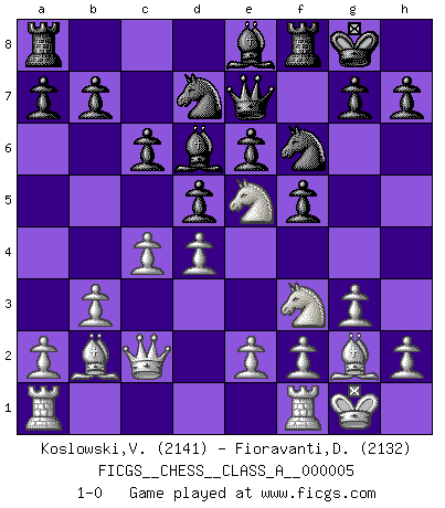Last move : 1-0 2006 August 15 19:14:48 [Event "FICGS__CHESS__CLASS_A__000005"] [Site "FICGS"] [Date "2006.06.20"] [Round "1"] [White "Koslowski,Volker"] [Black "Fioravanti,Diego"] [Result "1-0"] [WhiteElo "2141"] [BlackElo "2132"] 1.d4 f5 2.Nf3 Nf6 3.g3 e6 4.c4 d5 5.Bg2 c6 6.O-O Bd6 7.b3 Qe7 8.Bb2 O-O 9.Ne5 Bd7 10.Nd2 Be8 11.Ndf3 Nbd7 12.Qc2 1-0 Dutch Kingside Castling by player White (move 6) Kingside Castling by player Black (move 8) Player White won this chess game. Follow this game move after move (download)We cannot resist the fascination of sacrifice, since a passion for sacrifices is part of a Chessplayer's nature. (Rudolf Spielman) Das Schach hält seine Meister in eigenen Banden, Fesseln; auf vielerlei Weise formt es ihren Geist, so dass die innere Freiheit selbst des Stärksten beeinflusst wird. (Albert Einstein) Muchos se han convertido en Maestros de Ajedrez, nadie se ha convertido en el Maestro del Ajedrez. (Siegbert Tarrasch) Assurément je connaissais par expérience le mystérieux attrait de ce jeu royal, le seul entre tous les jeux inventés par les hommes qui échappe souverainement à la tyrannie du hasard, le seul où l'on ne doive sa victoire qu'à son intelligence ou plutôt à une certaine forme d'intelligence. Mais n'est-ce pas déjà le limiter injurieusement que d'appeler les échecs un jeu ? N'est-ce pas une science, un art ou quelque chose qui, comme le cercueil de Mahomet entre ciel et terre, est suspendu entre l'un et l'autre, et qui réunit un nombre incroyable de contraires ? [...] C'est une pensée qui ne mène à rien, une mathématique qui n'établit rien, un art qui ne laisse pas d'uvre, une architecture sans matière; et il l'a prouvé néanmoins qu'il était plus durable, à sa manière, que les livres ou que tout autre monument, ce jeu unique qui appartient à tous les peuples et à tous les temps, et dont personne ne sait quel dieu en fit don à la terre pour tuer l'ennui, pour aiguiser l'esprit et stimuler l'âme. Où commence-t-il, où finit-il ? (Stefan Zweig) Perseverance does not equal worthiness. Next time you want to get my attention, wear something fun. Low-riding jeans are hot. (Gregory House, House M.D.)
