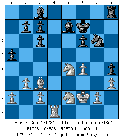 Last move : 1/2-1/2 2020 July 11 2:14:3 [Event "FICGS__CHESS__RAPID_M__000114"] [Site "FICGS"] [Date "2020.05.03"] [Round "1"] [White "Cesbron,Guy"] [Black "Cirulis,Ilmars"] [Result "1/2-1/2"] [WhiteElo "2172"] [BlackElo "2180"] 1.e4 e5 2.Nf3 Nc6 3.Bb5 Nf6 4.O-O Nxe4 5.d4 Nd6 6.Bxc6 dxc6 7.dxe5 Nf5 8.Qxd8+ Kxd8 9.Nc3 Bd7 10.h3 Be7 11.Bf4 Nh4 12.Ng5 Ke8 13.Nge4 Be6 14.Rad1 Rd8 15.Rxd8+ Kxd8 16.Rd1+ Ke8 17.Be3 a5 18.b3 Ng6 19.f4 h5 20.Ne2 Bf5 21.N2g3 Bc8 22.Ne2 f6 23.exf6 gxf6 24.Bc5 Bd8 25.Kf2 h4 26.Bd4 Kf7 27.Bc3 Be7 1/2-1/2 Ruy Lopez : Berlin defense, Open variation Kingside Castling by player White (move 4) This chess game ended in a draw. Follow this game move after move (download)A bad plan is better than none at all. (Frank Marshall) Schach ist wie eine schöne Frau, zu der wir ständig zurückkehren, gleichviel, wie oft sie uns zurückweist. (Anonymous) El arma más poderosa en el Ajedrez, es tener la próxima movida. (David Bronstein) Vouloir jouer aux échecs contre soi-même est aussi paradoxal que vouloir marcher sur son ombre. (Stefan Zweig) The obstacle is the path. (Zen proverb)