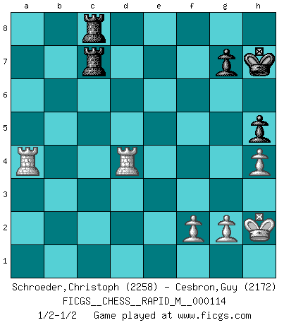 Last move : 1/2-1/2 2020 July 17 2:8:22 [Event "FICGS__CHESS__RAPID_M__000114"] [Site "FICGS"] [Date "2020.05.03"] [Round "1"] [White "Schroeder,Christoph"] [Black "Cesbron,Guy"] [Result "1/2-1/2"] [WhiteElo "2258"] [BlackElo "2172"] 1.e4 e6 2.d4 d5 3.Nc3 dxe4 4.Nxe4 Nd7 5.Nf3 Ngf6 6.Bg5 h6 7.Nxf6+ Nxf6 8.Bh4 c5 9.Bc4 cxd4 10.O-O Be7 11.Qe2 O-O 12.Rad1 Qb6 13.Nxd4 Qxb2 14.Nf5 exf5 15.Qxe7 Be6 16.Bxe6 fxe6 17.Qxe6+ Kh8 18.Qxf5 Qxa2 19.Rd6 Ng8 20.Qe4 a5 21.h3 Rf7 22.Rfd1 a4 23.Rd8 Rf8 24.R8d7 Nf6 25.Bxf6 Rxf6 26.Rxb7 Qe6 27.Qxe6 Rxe6 28.Rb2 Rc6 29.Ra2 Rac8 30.Rxa4 Rxc2 31.Rd7 R2c7 32.R7d4 Kh7 33.h4 h5 34.Kh2 1/2-1/2 French : Rubinstein variation Kingside Castling by player White (move 10) Kingside Castling by player Black (move 11) This chess game ended in a draw. Follow this game move after move (download)When your house is on fire, you can't be bothered with the neighbors. Or, as we say in Chess, if your King is under attack you don't worry about losing a Pawn on the Queen's side. (Gary Kasparov) Fischer ist das größte Genie, das je vom Schachhimmel heruntergestiegen ist. (Mikhail Nekhemyevich Tal) El Ajedrez expande y enriquece tu mente. (Saudin Robovic) Toute estimation doit être constamment réévaluée. (Jacob Estrin) Every vice is only an exaggeration of a necessary and virtuous function. (Ralph Waldo Emerson, Journals 1936)
