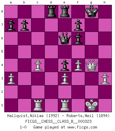 Last move : 1-0 2020 October 14 16:8:36 [Event "FICGS__CHESS__CLASS_B__000323"] [Site "FICGS"] [Date "2020.05.05"] [Round "1"] [White "Hallqvist,Niklas"] [Black "Roberts,Neil"] [Result "1-0"] [WhiteElo "1992"] [BlackElo "1894"] 1.c4 e5 2.g3 Nf6 3.Bg2 c6 4.Nc3 d5 5.d4 e4 6.Qb3 dxc4 7.Qxc4 Be6 8.Qa4 Na6 9.Nh3 Bb4 10.a3 Bxc3+ 11.bxc3 h6 12.Nf4 Bf5 13.Rb1 Qc8 14.c4 O-O 15.e3 Nc7 16.O-O Re8 17.Bb2 Ne6 18.Rbc1 Nxf4 19.exf4 e3 20.fxe3 Be4 21.Rfe1 Qf5 22.Qd1 Rad8 23.h3 h5 24.d5 cxd5 25.Bxf6 gxf6 26.g4 Qe6 27.Bxe4 dxe4 28.Qe2 hxg4 29.Qxg4+ 1-0 This chess game has been lost on time (started : 2020.05.05 21:0:9) English Opening Kingside Castling by player Black (move 14) Kingside Castling by player White (move 16) Player White won this chess game. Follow this game move after move (download)The older I grow, the more I value pawns. (Paul Keres) Rauchen ist dem Schachspieler bei seiner Arbeit, also im Wettkampf, untersagt. (Viktor Kortschnoi) Fischer es el jugador mas fuerte del mundo. De hecho, el jugador mas fuerte que jamas haya existido. (Larry Evans) Un millionnaire : 'Monsieur Steinitz ! Vous ne participez aux tournois que pour l'argent, alors que moi je n'y viens que pour l'honneur.' Steinitz : 'Chacun joue pour ce qu'il n'a pas'... Now be brave and don't look back. Don't look back. (Shmi Skywalker in Star Wars ep.1)