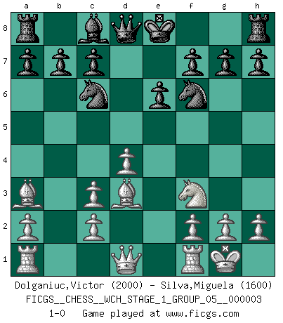 Last move : 1-0 2007 August 22 17:3:47 [Event "FICGS__CHESS__WCH_STAGE_1_GROUP_05__000003"] [Site "FICGS"] [Date "2007.07.11"] [Round "1"] [White "Dolganiuc,Victor"] [Black "Silva,Miguela"] [Result "1-0"] [WhiteElo "2000"] [BlackElo "1600"] 1.e4 d5 2.exd5 Qxd5 3.Nc3 Qd8 4.d4 e6 5.Nf3 Bb4 6.Bd3 Bxc3+ 7.bxc3 Nf6 8.O-O Nc6 9.Ba3 1-0 This chess game has been lost on time (started : 2007.07.11 16:54:55) Scandinavian (centre counter) defense Kingside Castling by player White (move 8) Player White won this chess game. Follow this game move after move (download)After black's reply to 1.e4 with 1..e5, leaves him always trying to get into the game. (Howard Staunton) Das typische an einem Großmeister ist, daß er eine gewonnene Position schnell und schmerzlos gewinnt. (Irving Chernev) Yo nunca en mi vida he jugado la Defensa Francesa, que viene siendo la más aburrida de todas las Aperturas. (Wilhelm Steinitz) A chaque perte on perd un peu de soi. (Joël Lautier) Political correctness is subjecting us to gross incompetence. (Johann Piek)