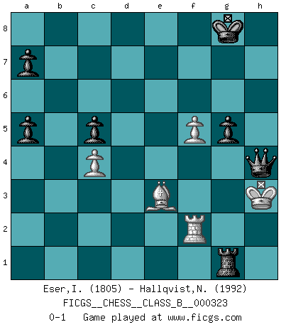 Last move : 0-1 2021 January 2 16:43:29 [Event "FICGS__CHESS__CLASS_B__000323"] [Site "FICGS"] [Date "2020.05.05"] [Round "1"] [White "Eser,Ipekyilmaz"] [Black "Hallqvist,Niklas"] [Result "0-1"] [WhiteElo "1805"] [BlackElo "1992"] 1.a3 c5 2.g3 g6 3.Bg2 Bg7 4.d3 e6 5.c3 d5 6.Qc2 b6 7.a4 Ne7 8.Na3 Nbc6 9.h3 e5 10.h4 h6 11.Bd2 Bg4 12.f3 Be6 13.Nh3 Nf5 14.Kf2 d4 15.f4 Qd7 16.Nc4 O-O 17.h5 exf4 18.gxf4 Rae8 19.Rh2 Bxc4 20.Bxc6 Qxc6 21.dxc4 dxc3 22.bxc3 Bd4+ 23.cxd4 Nxd4 24.Qd3 Rxe2+ 25.Qxe2 Nxe2 26.Kxe2 Qe4+ 27.Kd1 Rd8 28.hxg6 fxg6 29.Rc1 Qd3 30.Ke1 Qg3+ 31.Rf2 Rd3 32.Ke2 Qxh3 33.Rcf1 Rb3 34.Rf3 Qg4 35.Bc1 h5 36.Bd2 h4 37.R1f2 h3 38.Be3 Qe6 39.Rh2 Qe4 40.Kf2 Rb2+ 41.Kg3 Rxh2 42.Rf1 Rg2+ 43.Kxh3 g5 44.a5 bxa5 45.Rf2 Rg1 46.f5 Qh4+ 0-1 This chess game has been lost on time (started : 2020.05.05 21:0:9) Follow this game move after move (download)I won't play with you anymore. You have insulted my friend. - When an opponent cursed himself for a blunder. (Miguel Najdorf) Ich organisiere ein großes Turnier, was mich etwa 120000 Dollar kostet. Ich denke, das ist das erste Mal in der Schachgeschichte, daß ein Schachgroßmeister auch als Mäzen auftritt. (Miguel Najdorf) La estratégia requiere pensar, la táctica requiere observación. (Max Euwe) Même si vous avez un bon coup à faire, regardez toujours s'il n'y en a pas un qui lui soit préférable. (Pedro Damiano) The production of too many useful things results in too many useless people. (Karl Marx)