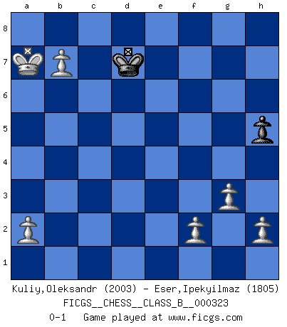 Last move : 0-1 2021 April 1 16:0:27 [Event "FICGS__CHESS__CLASS_B__000323"] [Site "FICGS"] [Date "2020.05.05"] [Round "1"] [White "Kuliy,Oleksandr"] [Black "Eser,Ipekyilmaz"] [Result "0-1"] [WhiteElo "2003"] [BlackElo "1805"] 1.d4 f6 2.e4 e6 3.c4 f5 4.exf5 exf5 5.Bd3 d6 6.Nf3 g6 7.O-O Bg7 8.Re1+ Kf8 9.Nc3 h6 10.Nd5 Nc6 11.Nf4 Nce7 12.Nh4 Kf7 13.Qf3 Nf6 14.Rxe7+ Qxe7 15.Bd2 g5 16.Nfg6 Qd8 17.Nxh8+ Qxh8 18.Nxf5 Qf8 19.Re1 Bxf5 20.Bxf5 Re8 21.Rxe8 Qxe8 22.Qxb7 Qe2 23.Qxc7+ Kg8 24.Qc8+ Kf7 25.g3 g4 26.Qb7+ Kg8 27.Bg6 d5 28.Qb8+ Bf8 29.Qf4 Qd1+ 30.Kg2 Qf3+ 31.Qxf3 gxf3+ 32.Kxf3 dxc4 33.Bf5 Kf7 34.Bh3 Ne8 35.Ke4 Nf6+ 36.Kf5 Bg7 37.Bf1 Ke7 38.Bxc4 Ne8 39.Ke4 Nd6+ 40.Kd5 Nxc4 41.Kxc4 Kf7 42.Bc3 Bf8 43.Kb5 Ke6 44.Kc6 Kf5 45.d5 h5 46.d6 a6 47.d7 Be7 48.Ba5 Ke4 49.d8Q Bxd8 50.Bxd8 Kd3 51.Kb6 Ke4 52.Kxa6 Kf5 53.b4 Ke6 54.b5 Kd7 55.b6 Kxd8 56.Ka7 Kc8 57.b7+ Kd7 0-1 Follow this game move after move (download)Fischer sacrificed virtually everything most of us weakies (to use his term) value, respect, and cherish, for the sake of an artful, often beautiful board game, for the ambivalent privilege of being its greatest master. (Paul Kollar) Mit Schach schule ich mein Gefühl für Geometrie, was für Tennis und Schach gleichermaßen wichtig ist. (Boris Becker) Yo adoro todas la posiciones. Denme una partida posicional difícil, y la jugaré. Pero posiciones totalmente ganadas, no las tolero. (Hein Donner) Pour se monter efficace, un Cavalier a besoin d'avant-postes ! Les Cavaliers font les meilleurs bloqueurs de pions passés. When a man with money meets a man with experience, the man with experience leaves with money and the man with money leaves with experience. (Anonymous)