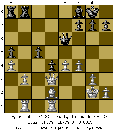 Last move : 1/2-1/2 2020 September 8 11:38:37 [Event "FICGS__CHESS__CLASS_B__000323"] [Site "FICGS"] [Date "2020.05.05"] [Round "1"] [White "Dyson,John"] [Black "Kuliy,Oleksandr"] [Result "1/2-1/2"] [WhiteElo "2118"] [BlackElo "2003"] 1.Nf3 Nf6 2.c4 e6 3.d4 d5 4.g3 dxc4 5.Bg2 a6 6.O-O Nc6 7.e3 Bd7 8.Qe2 Bd6 9.Qxc4 O-O 10.Rd1 Rb8 11.Nbd2 Qe7 12.Qc2 Nb4 13.Qb1 Bb5 14.Bf1 Bxf1 15.Kxf1 Rbd8 16.a3 Nc6 17.e4 e5 18.d5 Nd4 19.Nxd4 exd4 20.Kg2 c5 21.dxc6 bxc6 22.f3 c5 23.Qd3 a5 24.Nc4 Nd7 25.b3 Ne5 26.Nxe5 Qxe5 27.Bd2 Ra8 28.f4 Qe6 29.a4 Rfb8 30.Rab1 Bf8 1/2-1/2 Reti Opening Kingside Castling by player White (move 6) Kingside Castling by player Black (move 9) This chess game ended in a draw. Follow this game move after move (download)Life is a kind of Chess, with struggle, competition, good and ill events. (Benjamin Franklin) Je älter ich werde, um so mehr schätze ich die Bauern. (Paul Keres) El poder defensivo de una pieza clavada, solamente es imaginario. (Aaron Nimzovich) Ce n'est pas pour s'amuser qu'il joue aux échecs : il célèbre un culte. (Vladimir Nabokov) Life is like internet, nothing interesting, but noone want to leave it. (Ilmars Cirulis)