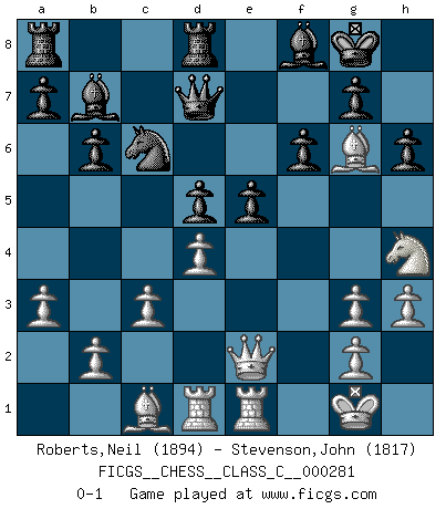 Last move : 0-1 2020 December 10 3:7:51 [Event "FICGS__CHESS__CLASS_C__000281"] [Site "FICGS"] [Date "2020.05.09"] [Round "1"] [White "Roberts,Neil"] [Black "Stevenson,John"] [Result "0-1"] [WhiteElo "1894"] [BlackElo "1817"] 1.d4 Nf6 2.Bf4 e6 3.e3 b6 4.Nf3 Bb7 5.Bd3 Be7 6.h3 c5 7.c3 O-O 8.O-O Nc6 9.Nbd2 d6 10.Qe2 cxd4 11.exd4 Qd7 12.Rfe1 Rfe8 13.Rad1 h6 14.a3 Bf8 15.Ne4 Nh5 16.Bc1 d5 17.Ng3 Nxg3 18.fxg3 f6 19.Bg6 Red8 20.Nh4 e5 0-1 Follow this game move after move (download)White lost because he failed to remember the right continuation and had to think up the moves himself. (Siegbert Tarrasch) Nicht daß Diemer aus Opportunismus Mitglied der NSDAP geworden wäre. Er war ein Fanatiker, in allem, was er tat. (Hans Ree) El Ajedrez tiene tanto misterio como las mujeres. (Purdy) Vous m'avez demandé de vous exposer quel est le fondement de la prière. Je ne fais que préparer les pièces du jeu sur la table... Nous sera-t-il permis d'en adopter les règles et si nous les appliquons scrupuleusement nous ne tarderons pas à faire mat le Roi divin ! Il ne pourra échapper à nos mains. (Sainte Thérèse d'Avila, Chemin de perfection) To steal ideas from one person is plagiarism. To steal from many is research. (Unknown)