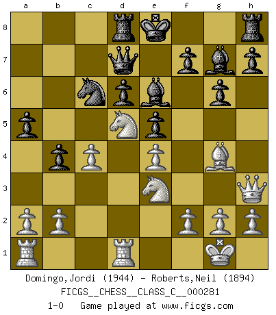Last move : 1-0 2020 December 14 14:23:32 [Event "FICGS__CHESS__CLASS_C__000281"] [Site "FICGS"] [Date "2020.05.09"] [Round "1"] [White "Domingo,Jordi"] [Black "Roberts,Neil"] [Result "1-0"] [WhiteElo "1944"] [BlackElo "1894"] 1.e4 c5 2.Nf3 Nc6 3.d4 cxd4 4.Nxd4 Nf6 5.Nc3 e5 6.Ndb5 d6 7.Bg5 a6 8.Na3 b5 9.Nd5 Be7 10.Bxf6 Bxf6 11.c4 b4 12.Nc2 a5 13.Be2 g6 14.Qd3 Bg7 15.O-O Rb8 16.Rfd1 Be6 17.Nde3 Qb6 18.Bg4 Rd8 19.Nd5 Qa7 20.Qh3 Qd7 21.Nce3 1-0 This chess game has been lost on time (started : 2020.05.09 10:6:1) Follow this game move after move (download)Dazzling combinations are for the many, shifting wood is for the few. (Georg Kieninger) Je mehr ich von der FIDE weiss, um so weniger verstehe ich. (Alexander Kalifman) Los finales de Peón son del Ajedrez lo que el cesped es del Golf. (Cecil Purdy) Les écrivains ont utilisé les échecs pour analyser les côtés extrêmes de la nature humaine. Dans ce cadre, les échecs offrent un champ d'expérimentation idéal. Mais on pourrait faire la même chose avec la peinture. Et là, en vous référant à Van Gogh, vous ne tirerez pas de conclusion définitive sur les peintres. (Gary Kasparov) Life is like a ten-speed bicycle: most of us have gears we never use. (Charles M. Schulz)