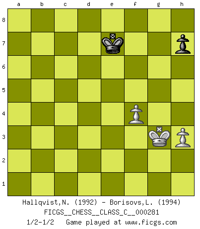 Last move : 1/2-1/2 2020 July 8 8:43:15 [Event "FICGS__CHESS__CLASS_C__000281"] [Site "FICGS"] [Date "2020.05.09"] [Round "1"] [White "Hallqvist,Niklas"] [Black "Borisovs,Leonids"] [Result "1/2-1/2"] [WhiteElo "1992"] [BlackElo "1994"] 1.c4 Nf6 2.g3 g6 3.Bg2 Bg7 4.d4 O-O 5.Nc3 d6 6.Nf3 Bf5 7.Nh4 Bc8 8.O-O c6 9.e4 e5 10.Nf3 Nbd7 11.Qc2 exd4 12.Nxd4 Re8 13.Rd1 Qe7 14.Bf4 Ne5 15.b3 a6 16.h3 b5 17.c5 dxc5 18.Bxe5 cxd4 19.Bxd4 Nh5 20.Rd3 Bb7 21.Rad1 Bxd4 22.Rxd4 Rad8 23.Qd3 Rxd4 24.Qxd4 c5 25.Qd6 Kg7 26.Qxe7 Rxe7 27.a4 g5 28.Nd5 Re5 29.axb5 axb5 30.Rc1 c4 31.bxc4 bxc4 32.Rxc4 Bxd5 33.exd5 Nf6 34.Rd4 Nd7 35.d6 Rc5 36.Rd1 Rc8 37.Be4 Ne5 38.Kh2 Rd8 39.f4 gxf4 40.gxf4 Nc4 41.d7 Nb6 42.Rd6 Nc4 43.Rd4 Nb6 44.Bc6 Kf6 45.Bb5 Ke7 46.Re4+ Kd6 47.Re8 Kc7 48.Re7 Nd5 49.Rxf7 Nc3 50.Rf5 Nxb5 51.Rxb5 Rxd7 52.Kg3 Kd6 53.Re5 Re7 54.Rxe7 Kxe7 1/2-1/2 English, 1...Nf6 (Anglo-Indian defense) Kingside Castling by player Black (move 4) Kingside Castling by player White (move 8) 10 pieces endgame at move 49 : White KRBPPP , Black KRNP WHITE : King + 1 Rook 1 Bishop 3 Pawns BLACK : King + 1 Rook 1 Knight 1 Pawn 9 pieces endgame at move 50 : White KRPPP , Black KRNP WHITE : King + 1 Rook 3 Pawns BLACK : King + 1 Rook 1 Knight 1 Pawn 8 pieces endgame at move 51 : White KRPPP , Black KRP WHITE : King + 1 Rook 3 Pawns BLACK : King + 1 Rook 1 Pawn 7 pieces endgame at move 51 : White KRPP , Black KRP WHITE : King + 1 Rook 2 Pawns BLACK : King + 1 Rook 1 Pawn 6 pieces endgame at move 54 : White KRPP , Black KP WHITE : King + 1 Rook 2 Pawns BLACK : King + 1 Pawn 5 pieces endgame at move 54 : White KPP , Black KP WHITE : King + 2 Pawns BLACK : King + 1 Pawn This chess game ended in a draw. Follow this game move after move (download)Play the opening like a book, the middle game like a magician, and the endgame like a machine. (Spielmann) Jede Eröffnung ist gut genug um gespielt zu werden, wenn nur ihr Ruf schlecht genug ist. (Savielly Grigorievitsch Tartakower) Yo he agregado estos principios a la ley: pongan los Caballos en acción antes de que los dos Alfiles sean desarrollados. (Emanuel Lasker) RxDa4 pat (...) Wisdom is the reward you get for a lifetime of listening when you'd have preferred to talk. (Doug Larson)