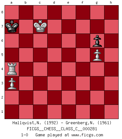 Last move : 1-0 2021 March 23 12:57:49 [Event "FICGS__CHESS__CLASS_C__000281"] [Site "FICGS"] [Date "2020.05.09"] [Round "1"] [White "Hallqvist,Niklas"] [Black "Greenberg,Normund"] [Result "1-0"] [WhiteElo "1992"] [BlackElo "1961"] 1.c4 e5 2.g3 Nf6 3.Bg2 c6 4.Nf3 Qc7 5.Qc2 Bc5 6.O-O O-O 7.a3 e4 8.Ne1 d5 9.Nc3 Bf5 10.cxd5 cxd5 11.d3 Nbd7 12.dxe4 dxe4 13.Nxe4 Nxe4 14.Bxe4 Bxe4 15.Qxe4 Rfe8 16.Qf3 Ne5 17.Qb3 Qc6 18.Bf4 Ng6 19.e3 Rad8 20.Ng2 b6 21.Rad1 h6 22.Rxd8 Rxd8 23.Rd1 Rc8 24.Qc2 Qe6 25.Rc1 Rd8 26.Qe2 Be7 27.Rc2 Bf6 28.e4 b5 29.Bc1 Bd4 30.h4 a6 31.h5 Ne5 32.Nf4 Qb3 33.Kg2 Nf3 34.Rc7 Ne5 35.Nd5 Kf8 36.Nb4 a5 37.Nc6 Nxc6 38.Rxc6 a4 39.Qc2 Ke8 40.Rc8 Qxc2 41.Rxc2 Bb6 42.Bf4 Ke7 43.Bd2 Rb8 44.Bb4+ Ke8 45.Kf3 Rd8 46.e5 Rd1 47.Ke4 Kd7 48.g4 Rf1 49.f3 Bd8 50.Rc5 Rf2 51.f4 Rxb2 52.Rd5+ Kc8 53.Rc5+ Kb7 54.Rxb5+ Kc6 55.Rc5+ Kb6 56.Rc8 Bh4 57.Rf8 g6 58.hxg6 fxg6 59.Rg8 Kb5 60.Kd5 Bg3 61.Rb8+ Ka6 62.Kc6 Rc2+ 63.Bc5 Rxc5+ 64.Kxc5 Bxf4 65.Kc6 Ka7 66.e6 Bg5 67.Rb7+ Ka8 68.e7 Bxe7 69.Rxe7 Kb8 70.Rh7 h5 71.g5 h4 72.Rxh4 Ka8 73.Kc7 Ka7 74.Rxa4+ 1-0 Follow this game move after move (download)Bobby is the most misunderstood, misquoted celebrity walking the face of this earth. (Yasser Seirawan) Fischer: 'Remis!?' Uhlmann: 'Aber es muss doch dreimal Zugwiederholung sein!' Fischer: 'Sie nehmen das Remis an, wie ich es sage, sonst spiele ich weiter und werde Sie dann schlagen!' (Robert James Fischer) Bobby es el jugador de Ajedrez mas fino que este país jamás haya producido. Su memoria para las movidas, su brillantez en soñar combinaciones y su feróz determinación por la victoria son algo extraño. (John Collins) Les réformistes prétendent que les progrès de la théorie conduiront à la disparition des échecs, et qu'il faut, pour leur rendre vie, en remanier les règles. En réalité, qu'exprime cette affirmation? Le mépris de l'intuition, de l'imagination et de tous les autres éléments qui font des échecs un art. (Alexander Alekhine) In my experience, there's no such thing as luck. (Obi-Wan Kenobi in Star Wars ep.4)