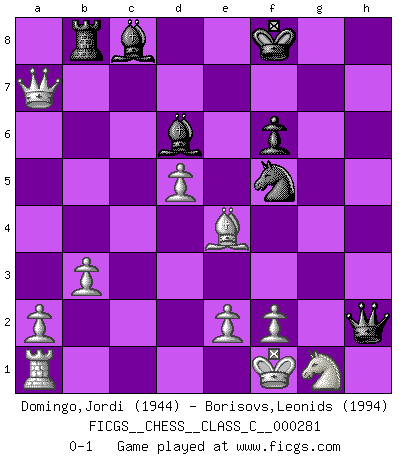 Last move : 0-1 2020 August 11 19:1:43 [Event "FICGS__CHESS__CLASS_C__000281"] [Site "FICGS"] [Date "2020.05.09"] [Round "1"] [White "Domingo,Jordi"] [Black "Borisovs,Leonids"] [Result "0-1"] [WhiteElo "1944"] [BlackElo "1994"] 1.g4 d5 2.Bg2 c6 3.g5 h6 4.h4 hxg5 5.hxg5 Rxh1 6.Bxh1 e5 7.d4 e4 8.c4 Ne7 9.Nc3 Qc7 10.Bg2 Qh2 11.Kf1 Be6 12.Qb3 Nd7 13.cxd5 cxd5 14.g6 Nf6 15.Qxb7 Rb8 16.gxf7+ Kxf7 17.Qxa7 Ke8 18.Bg5 Nf5 19.Bxf6 gxf6 20.Nxe4 dxe4 21.Bxe4 Bd6 22.b3 Kf8 23.d5 Bc8 0-1 Grob : Spike attack Player Black won this chess game. Follow this game move after move (download)Examine moves that smite! A good eye for smites is far more important than a knowledge of strategical principles. (Purdy) Warum muß ich gegen diesen IDIOTEN verlieren? (Aaron Nimzowitsch) Yo no creo en la psicología. Yo creo en las buenas movidas. (Bobby Fischer) On entre au jeu d'Echecs comme on entre en Religion. Pour le joueur d'Echecs, la partie d'Echecs c'est l'office, la messe, le défilé du 1er Mai, le dépôt de gerbe au Monument aux Morts. C'est un drame sacré. (Michel Roos) Home computers are being called upon to perform many new functions, including the consumption of homework formerly eaten by the dog. (Doug Larson)