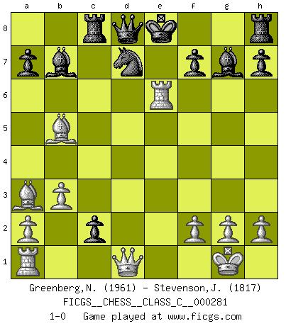 Last move : 1-0 2020 August 24 17:9:44 [Event "FICGS__CHESS__CLASS_C__000281"] [Site "FICGS"] [Date "2020.05.09"] [Round "1"] [White "Greenberg,Normund"] [Black "Stevenson,John"] [Result "1-0"] [WhiteElo "1961"] [BlackElo "1817"] 1.d4 Nf6 2.c4 e6 3.Nf3 d5 4.Nc3 c6 5.e3 Nbd7 6.Bd3 dxc4 7.Bxc4 b5 8.Bd3 Bb7 9.e4 b4 10.Na4 c5 11.e5 Nd5 12.O-O cxd4 13.Nxd4 Nxe5 14.Bb5+ Nd7 15.Re1 Rc8 16.b3 Bd6 17.Nf5 Bf8 18.Bb2 Nc3 19.Nxc3 bxc3 20.Nxg7+ Bxg7 21.Ba3 c2 22.Rxe6+ 1-0 Queen's pawn game Kingside Castling by player White (move 12) Player White won this chess game. Follow this game move after move (download)Winning isn't everything... but losing is nothing. (Mednis) Im Fernschach kannst du während dem Spiel rauchen. (John Christen Knudsen) La pasion por jugar al Ajedrez es una de las mas inexplicables en el mundo. (H.G. Wells) Des combinaisons [dans le jeu d'échecs] pareilles à des mélodies. Je crois entendre pour ainsi dire la musique des coups... (Vladimir Nabokov) Always be a first-rate version of yourself, instead of a second-rate version of somebody else. (Judy Garland)