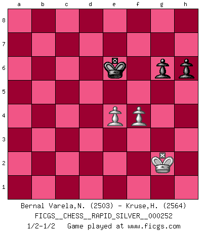 Last move : 1/2-1/2 2020 September 3 1:58:25 [Event "FICGS__CHESS__RAPID_SILVER__000252"] [Site "FICGS"] [Date "2020.05.11"] [Round "2"] [White "Bernal Varela,Nelson"] [Black "Kruse,Herbert"] [Result "1/2-1/2"] [WhiteElo "2503"] [BlackElo "2564"] 1.c4 e5 2.g3 Nf6 3.Bg2 d5 4.cxd5 Nxd5 5.Nc3 Nb6 6.Nf3 Nc6 7.d3 Be7 8.O-O O-O 9.a3 Be6 10.Be3 Nd5 11.Nxd5 Bxd5 12.Rc1 Qd7 13.Re1 h6 14.Qa4 Rad8 15.Nd2 Bxg2 16.Kxg2 Kh7 17.Qb3 Qc8 18.Bc5 Rd7 19.h3 Nd4 20.Qa4 b5 21.Qa5 Bxc5 22.Rxc5 a6 23.Qb4 Re8 24.a4 Qa8+ 25.Kh2 e4 26.dxe4 Ne6 27.Rc2 c5 28.Qa3 Red8 29.Qe3 bxa4 30.e5 Rb8 31.Rec1 Rd4 32.h4 R8b4 33.b3 Qd8 34.f3 Rxh4+ 35.gxh4 Qxh4+ 36.Kg1 Nf4 37.Rc4 Rxc4 38.bxc4 Qg3+ 39.Kf1 Qh3+ 40.Kf2 Qg2+ 41.Ke1 Qh1+ 42.Kf2 Qg2+ 43.Ke1 Qh1+ 44.Kf2 Nh3+ 45.Kg3 Qxc1 46.Kxh3 Qh1+ 47.Kg3 Qe1+ 48.Kg2 a3 49.Qe4+ g6 50.Nb3 a2 51.e6 fxe6 52.Qxe6 a1Q 53.Nxa1 Qxa1 54.Qe7+ Qg7 55.Qxc5 Qf7 56.e4 a5 57.Qc6 Kg7 58.Qb5 Qc7 59.c5 a4 60.c6 a3 61.Qa4 a2 62.Qxa2 Qxc6 63.Qa1+ Qf6 64.Qxf6+ Kxf6 65.f4 Ke6 1/2-1/2 English Opening Kingside Castling by player White (move 8) Kingside Castling by player Black (move 8) Promotion Queen by player Black (move 52) 10 pieces endgame at move 55 : White KQPPP , Black KQPPP WHITE : King + 1 Queen 3 Pawns BLACK : King + 1 Queen 3 Pawns 9 pieces endgame at move 62 : White KQPPP , Black KQPP WHITE : King + 1 Queen 3 Pawns BLACK : King + 1 Queen 2 Pawns 8 pieces endgame at move 62 : White KQPP , Black KQPP WHITE : King + 1 Queen 2 Pawns BLACK : King + 1 Queen 2 Pawns 7 pieces endgame at move 64 : White KQPP , Black KPP WHITE : King + 1 Queen 2 Pawns BLACK : King + 2 Pawns 6 pieces endgame at move 64 : White KPP , Black KPP WHITE : King + 2 Pawns BLACK : King + 2 Pawns This chess game ended in a draw. Follow this game move after move (download)Chess holds its master in its own bonds, shackling the mind and brain so that the inner freedom of the very strongest must suffer. (Albert Einstein) Kleine Schachspieler machen Mist, und große Schachspieler machen Mist, aber große machen weniger Mist. (Fritz Sämisch) Nada excita más a Grandes Maestros aburridos que una novedad teórica. (Dominic Lawson) Le jeu d'échecs est comme rejeté hors du temps. (Antoine de Saint-Exupéry) Creativity is allowing yourself to make mistakes. Art is knowing which ones to keep. (Scott Adams)