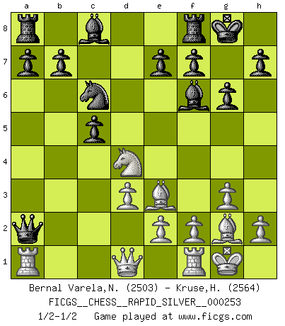 Last move : 1/2-1/2 2020 May 28 22:30:55 [Event "FICGS__CHESS__RAPID_SILVER__000253"] [Site "FICGS"] [Date "2020.05.11"] [Round "2"] [White "Bernal Varela,Nelson"] [Black "Kruse,Herbert"] [Result "1/2-1/2"] [WhiteElo "2503"] [BlackElo "2564"] 1.c4 c5 2.Nf3 Nf6 3.g3 d5 4.cxd5 Nxd5 5.Bg2 Nc6 6.Nc3 g6 7.O-O Bg7 8.Nxd5 Qxd5 9.d3 O-O 10.Be3 Bxb2 11.Rb1 Bf6 12.Nd4 Qxa2 13.Ra1 1/2-1/2 English : Symmetrical variation Kingside Castling by player White (move 7) Kingside Castling by player Black (move 9) This chess game ended in a draw. Follow this game move after move (download)I have added these principles to the law: get the Knights into action before both Bishops are developed. (Emanuel Lasker) Die Leute spielen gegen mich seit 15 Jahren unter Ihren Möglichkeiten. (Robert James Fischer) El Ajedrez es de 30 a 40 por ciento psicología. Uno no cuenta con esto cuando se juega contra una computadora. No lo puedo confundir. (Judith Polgar) Que feriez-vous si vous étiez en train de jouer aux échecs et que la fin du monde arrive ? Je continuerais à jouer. (Saint Borromée) Begin at the beginning and go on till you come to the end; then stop. (Lewis Carrol, Alice in Wonderland)