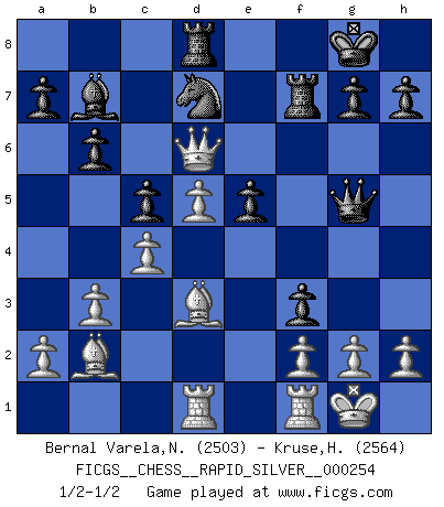 Last move : 1/2-1/2 2020 May 12 17:13:34 [Event "FICGS__CHESS__RAPID_SILVER__000254"] [Site "FICGS"] [Date "2020.05.11"] [Round "2"] [White "Bernal Varela,Nelson"] [Black "Kruse,Herbert"] [Result "1/2-1/2"] [WhiteElo "2503"] [BlackElo "2564"] 1.d4 Nf6 2.c4 c6 3.Nf3 d5 4.e3 e6 5.b3 b6 6.Bb2 Nbd7 7.Bd3 Bd6 8.O-O Bb7 9.Nbd2 O-O 10.Qe2 Qe7 11.Rad1 Rad8 12.e4 dxe4 13.Nxe4 Nxe4 14.Qxe4 f5 15.Qe3 c5 16.Ng5 e5 17.d5 f4 18.Qh3 Qxg5 19.Qe6+ Rf7 20.Qxd6 f3 1/2-1/2 Queen's pawn game Kingside Castling by player White (move 8) Kingside Castling by player Black (move 9) This chess game ended in a draw. Follow this game move after move (download)Chess is a beautiful mistress. (Bent Larsen) Ein unbeabsichtigtes Patt ist der Gipfel der Dummheit. (Anonymous) Una de estas pequeñas movidas modestas pudieran ser mas molestas a tu oponente que la amenaza mas grande. (Siegbert Tarrasch) Il a essayé de se convaincre qu'il pourrait empêcher toutes les erreurs et ne jamais perdre. L'horreur ! Gary Kasparov au sujet de Robert Fischer. Every vice is only an exaggeration of a necessary and virtuous function. (Ralph Waldo Emerson, Journals 1936)