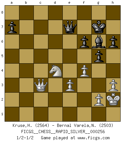 Last move : 1/2-1/2 2020 September 22 9:20:54 [Event "FICGS__CHESS__RAPID_SILVER__000256"] [Site "FICGS"] [Date "2020.05.11"] [Round "1"] [White "Kruse,Herbert"] [Black "Bernal Varela,Nelson"] [Result "1/2-1/2"] [WhiteElo "2564"] [BlackElo "2503"] 1.d4 e6 2.Bf4 c5 3.e3 Qb6 4.b3 Nf6 5.c3 d5 6.Bd3 Bd6 7.Ne2 O-O 8.O-O Nbd7 9.Nd2 e5 10.dxe5 Nxe5 11.Bxe5 Bxe5 12.Qc2 h6 13.Rfd1 Re8 14.h3 Qe6 15.Nf3 b6 16.Re1 Bb7 17.Ned4 Qd6 18.Nxe5 Rxe5 19.Nf3 R5e8 20.Nd2 Rad8 21.Rad1 Re6 22.Nf1 Bc6 23.Bf5 Re5 24.Nd2 Re7 25.Bd3 Re6 26.Bf5 R6e8 27.Bd3 Re6 28.a3 Qe7 29.b4 Bd7 30.bxc5 Qxc5 31.Qb2 Qe7 32.Nf3 Rc6 33.Rc1 Rc5 34.c4 Rdc8 35.cxd5 Nxd5 36.Rxc5 Rxc5 37.Rd1 Nc3 38.Rd2 Ba4 39.Bf1 Qf6 40.Kh2 g6 41.Rd4 Bb5 42.Bd3 Bc6 43.Ne1 Kh7 44.Bf1 Bb5 45.Bd3 Kg7 46.f4 g5 47.Qd2 Bc6 48.a4 Nxa4 49.Bc4 Nc3 50.Qxc3 b5 51.Nd3 Rxc4 52.Rxc4 bxc4 53.Qxc4 Qd6 54.Ne5 Be8 55.Qc8 Qe7 56.Qc3 f6 57.Nf3 Bg6 58.Nd4 1/2-1/2 Queen's pawn Kingside Castling by player Black (move 7) Kingside Castling by player White (move 8) This chess game ended in a draw. Follow this game move after move (download)The blunders are all there on the board, waiting to be made. (Savielly Tartakover) Ein Großmeister muß tausende Partien in seinem Kopf speichern, denn diese sind für Ihn, was die Worte der Muttersprache für gewöhnliche Leute sind, oder Noten für Musiker... (Garry Kasparov) Aún el Rey más flojo huye despavorido ante la amenaza de un Jaque doble. (Aaron Nimzowitsch) Le profane ne songe pas à la somme de jouissance dont il se prive, qui méconnaît ce jeu aux ressources aussi variées que passionnantes. (Jean-Marie Jeanton-Lamarche) No man has ever achieved immortality in his own life time. (Unknown)