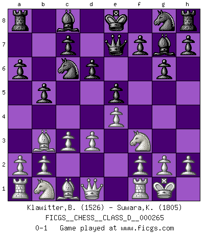 Last move : 0-1 2020 July 17 16:17:45 [Event "FICGS__CHESS__CLASS_D__000265"] [Site "FICGS"] [Date "2020.05.11"] [Round "1"] [White "Klawitter,Bernd"] [Black "Suwara,Kazimierz"] [Result "0-1"] [WhiteElo "1526"] [BlackElo "1805"] 1.e4 e5 2.Nf3 Nc6 3.Bb5 a6 4.Ba4 b5 5.Bb3 g6 6.c3 Bg7 7.d3 Qe7 8.O-O d6 0-1 This chess game has been lost on time (started : 2020.05.11 20:54:20) Ruy Lopez : Caro variation Kingside Castling by player White (move 8) Player Black won this chess game. Follow this game move after move (download)There are tough players and nice guys, and I'm a tough player. (Bobby Fischer) Der beste Spieler in einem Turnier gewinnt es nie. Er landet auf Platz zwei oder drei. (Siegbert Tarrasch) Yo nunca en mi vida he jugado la Defensa Francesa, que viene siendo la más aburrida de todas las Aperturas. (Wilhelm Steinitz) On entre au jeu d'Echecs comme on entre en Religion. Pour le joueur d'Echecs, la partie d'Echecs c'est l'office, la messe, le défilé du 1er Mai, le dépôt de gerbe au Monument aux Morts. C'est un drame sacré. (Michel Roos) To err is human, but to really foul things up requires a computer. (Farmer's Almanac, 1978)