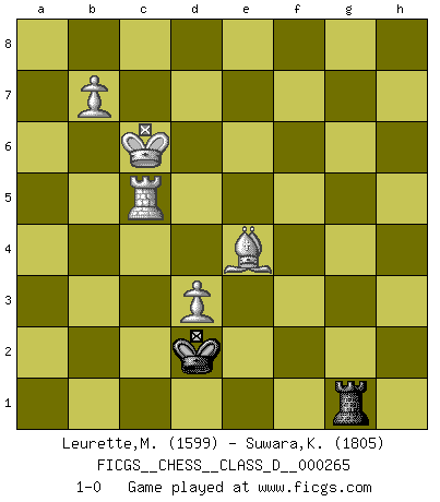 Last move : 1-0 2020 November 24 13:13:28 [Event "FICGS__CHESS__CLASS_D__000265"] [Site "FICGS"] [Date "2020.05.11"] [Round "1"] [White "Leurette,Marc-Antoine"] [Black "Suwara,Kazimierz"] [Result "1-0"] [WhiteElo "1599"] [BlackElo "1805"] 1.e4 e5 2.Nf3 Nc6 3.Bc4 Nf6 4.Ng5 Bc5 5.Nxf7 Bxf2+ 6.Kf1 Qe7 7.Nxh8 d5 8.exd5 Nd4 9.d6 cxd6 10.Kxf2 d5 11.Bd3 Ng4+ 12.Ke1 Qf6 13.Bb5+ Ke7 14.Rf1 Qh4+ 15.g3 Qxh2 16.d3 Nxc2+ 17.Qxc2 Qxc2 18.Nc3 Qg2 19.Rf7+ Ke6 20.Rxg7 Qxg3+ 21.Kd2 Qf2+ 22.Ne2 Nh2 23.Rxh7 Nf3+ 24.Kd1 Qf1+ 25.Kc2 Nd4+ 26.Nxd4+ exd4 27.Rh6+ Kf5 28.Ng6 Kf6 29.Bg5+ Kxg5 30.Rxf1 Kxh6 31.Ne7 a6 32.Ba4 b5 33.Bb3 Bd7 34.Bxd5 Re8 35.Nf5+ Kg5 36.Nxd4 Rh8 37.Rf7 Bg4 38.Be4 Rh2+ 39.Kb3 Bd1+ 40.Ka3 Bg4 41.Nf3+ Bxf3 42.Rxf3 Rh8 43.Kb4 Rh2 44.Kb3 Kg4 45.Rf6 a5 46.a3 Rh8 47.Rb6 Rh5 48.a4 bxa4+ 49.Kxa4 Kf4 50.Rb5 Rh2 51.Kxa5 Ke3 52.b4 Rf2 53.Rf5 Ra2+ 54.Kb5 Rc2 55.Kb6 Rc1 56.b5 Kd4 57.Kb7 Rg1 58.b6 Kc3 59.Kc7 Rg7+ 60.Kc6 Rg6+ 61.Kb5 Rg8 62.Rc5+ Kd2 63.b7 Rg1 64.Kc6 1-0 Follow this game move after move (download)First-class players lose to second-class players because second-class players sometimes play a first-class game. (Siegbert Tarrasch) Taktik ist was man tun muß, wenn etwas zu tun ist. Strategie ist was man tun muß, wenn nichts zu tun ist. (Savielly Grigorievitsch Tartakower) Peones: ellos son el alma de esta partida, solos forman el ataque y la defensa. (Philidor) Ce n'est pas pour s'amuser qu'il joue aux échecs : il célèbre un culte. (Vladimir Nabokov) Horse racing is animated roulette. (Roger Kahn)