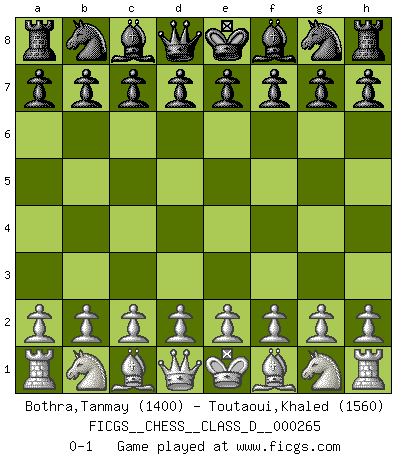 Last move : 0-1 2020 June 21 2:22:59 [Event "FICGS__CHESS__CLASS_D__000265"] [Site "FICGS"] [Date "2020.05.11"] [Round "1"] [White "Bothra,Tanmay"] [Black "Toutaoui,Khaled"] [Result "0-1"] [WhiteElo "1400"] [BlackElo "1560"] 0-1 This chess game has been lost on time (started : 2020.05.11 20:54:20) Player Black won this chess game. Follow this game move after move (download)The chessboard is the world, the pieces are the phenomena of the Universe, the rules of the game are what we call the laws of Nature and the player on the other side is hidden from us. (Thomas Huxley) Kasparov stellt für gewöhnlich die Regeln auf und bricht sie dann selbst wieder. (Alexej Shirov) La captura del Rey enemigo es la finalidad pero no el primer objetivo de la partida. (William Steinitz) Tout change constamment, y compris dans le monde des Echecs. (Botvinnik) Opportunities multiply as they are seized. (Sun Tzu)