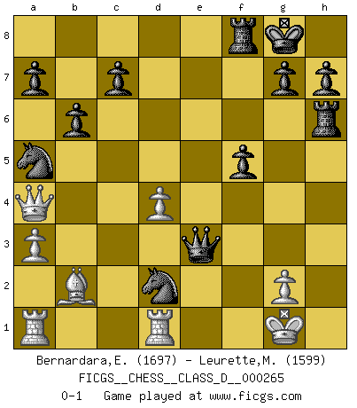 Last move : 0-1 2020 July 15 11:57:55 [Event "FICGS__CHESS__CLASS_D__000265"] [Site "FICGS"] [Date "2020.05.11"] [Round "1"] [White "Bernardara,Enos"] [Black "Leurette,Marc-Antoine"] [Result "0-1"] [WhiteElo "1697"] [BlackElo "1599"] 1.b4 e5 2.Bb2 Bxb4 3.Bxe5 Nf6 4.c4 Nc6 5.Bb2 d6 6.Nc3 Be6 7.e3 Qe7 8.Nf3 d5 9.cxd5 Bxd5 10.Nxd5 Nxd5 11.Be2 O-O 12.O-O Nf6 13.d4 Ne4 14.Qc2 Bd6 15.a3 f5 16.Rfb1 Na5 17.Qa4 b6 18.Rd1 Rae8 19.Nd2 Bxh2+ 20.Kxh2 Qh4+ 21.Kg1 Qxf2+ 22.Kh2 Qxe2 23.Bc1 Re6 24.Bb2 Nxd2 25.Kh1 Rh6+ 26.Kg1 Qxe3+ 0-1 Polish (Sokolsky) opening Kingside Castling by player Black (move 11) Kingside Castling by player White (move 12) Player Black won this chess game. Follow this game move after move (download)It began to feel as though you were playing against Chess itself. - On playing against Robert Fischer. (Walter Shipman) Weshalb minderdergeübte Spieler mit g2-g4 beginnen? Die betreffenden sind unschlüssig, ob sie nun rechts (h4) oder links (f4) beginnen sollen, und in ihrer Ratlosigkeit entschliessen sie sich nach guter Bürgerart dazu, den goldenen Mittelweg zu wählen. (Aaron Nimzowitsch) En el Ajedrez, cuando menos, el valiente hereda la tierra. (Edmar Mednis) Un footballeur joue avec ses pieds, parfois avec sa tête. Un joueur d'échecs ne joue qu'avec sa tête. Et quand il ne joue plus, il meurt. (Jacob Murray) The best weapon against an enemy is another enemy. (Friedrich Nietzsche)