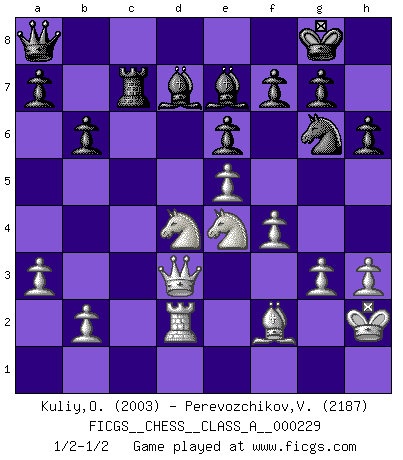 Last move : 1/2-1/2 2020 May 26 18:23:46 [Event "FICGS__CHESS__CLASS_A__000229"] [Site "FICGS"] [Date "2020.05.12"] [Round "1"] [White "Kuliy,Oleksandr"] [Black "Perevozchikov,Vjacheslav"] [Result "1/2-1/2"] [WhiteElo "2003"] [BlackElo "2187"] 1.d4 d5 2.c4 c5 3.cxd5 Qxd5 4.Nf3 cxd4 5.Nc3 Qa5 6.Nxd4 Nf6 7.Nb3 Qc7 8.e4 Nc6 9.Be3 e6 10.Rc1 Bb4 11.Bd3 O-O 12.a3 Be7 13.O-O Rd8 14.f4 Ng4 15.Qxg4 Rxd3 16.Qe2 Qd8 17.Rfd1 Rd7 18.Rxd7 Bxd7 19.h3 h6 20.e5 Bf8 21.Rd1 b6 22.Kh2 Qe8 23.Bf2 Ne7 24.Nd4 Rc8 25.Qd3 Ng6 26.g3 Be7 27.Ne4 Rc7 28.Rd2 Qa8 1/2-1/2 QGD : Symmetrical (Austrian) defense Kingside Castling by player Black (move 11) Kingside Castling by player White (move 13) This chess game ended in a draw. Follow this game move after move (download)No Chess Grandmaster is normal; they only differ in the extent of their madness. (Viktor Korchnoi) Den Ruhm habe ich schon, jetzt brauche ich noch das Geld. (Wilhelm Steinitz) El Ajedrez es realmente noventa y nueve por ciento calculación. (Soltis) Je fais ceci parce que dans cinquante coups j'obtiendrai cela; je m'appelle Mikhail Moisevitch Botvinnik. (Botvinnik) Dave, my mind is going. I can feel it. (HAL 9000 in 2001, a space odyssey)