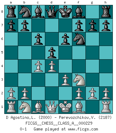 Last move : 0-1 2020 June 22 7:19:31 [Event "FICGS__CHESS__CLASS_A__000229"] [Site "FICGS"] [Date "2020.05.12"] [Round "1"] [White "D Agostino,Leonardo"] [Black "Perevozchikov,Vjacheslav"] [Result "0-1"] [WhiteElo "2000"] [BlackElo "2187"] 1.d4 d5 2.c4 c6 3.Nf3 Nf6 4.e3 e6 0-1 This chess game has been lost on time (started : 2020.05.12 13:48:31) QGD Slav : 4.e3 Player Black won this chess game. Follow this game move after move (download)The sign of a great Master is his ability to win a won game quickly and painlessly. (Irving Chernev) Modernes Schach erfordert enorme Anspannung. Es ist für einen normalen Menschen unmöglich das auszuhalten. (Viktor Kortschnoi) Con el tiempo, empecé a progresar en partidas decisivas. Tal vez porque me di cuenta de una simple verdad: no solo estaba yo nervioso sino también mi oponente. (Mikhail Tal) En blitz, le Cavalier l'emporte sur le Fou. (Vlastimil Hort) A clear conscience is usually the sign of a bad memory. (Unknown)