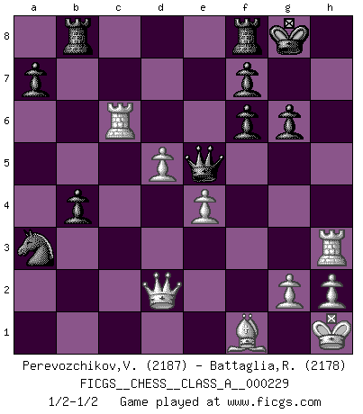 Last move : 1/2-1/2 2020 May 29 12:1:50 [Event "FICGS__CHESS__CLASS_A__000229"] [Site "FICGS"] [Date "2020.05.12"] [Round "1"] [White "Perevozchikov,Vjacheslav"] [Black "Battaglia,Roberto"] [Result "1/2-1/2"] [WhiteElo "2187"] [BlackElo "2178"] 1.Nf3 Nf6 2.c4 g6 3.d4 Bg7 4.Nc3 d5 5.cxd5 Nxd5 6.e4 Nxc3 7.bxc3 c5 8.Rb1 O-O 9.Be2 cxd4 10.cxd4 Qa5+ 11.Bd2 Qxa2 12.O-O Bg4 13.Be3 Nc6 14.d5 Na5 15.Bg5 Qa3 16.Re1 Bxf3 17.Bxf3 Be5 18.Bg4 Rab8 19.Kh1 b5 20.f4 Bc3 21.Re3 Qc5 22.Rh3 b4 23.f5 Nc4 24.fxg6 hxg6 25.Be2 Na3 26.Rc1 Qd6 27.Bf1 Bf6 28.Rc6 Qe5 29.Bxf6 exf6 30.Qd2 1/2-1/2 Reti Opening Kingside Castling by player Black (move 8) Kingside Castling by player White (move 12) This chess game ended in a draw. Follow this game move after move (download)There are two classes of men; those who are content to yield to circumstances and who play whist; those who aim to control circumstances, and who play Chess. (Mortimer Collins) Strategie ist, wie man ein Mädchen auf den Rücksitz bekommt. Taktik ist, was man tut, wenn man dann dort ist. (Anonymous) Vive, pierde y aprende al observar a tu oponente como gana. (Amber Steenbock) Soyez une menace à chaque fois que vous vous asseyez pour jouer. (Ken Smith) Life is verb, not a noun. (Charlotte Perkins Gilman)