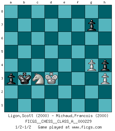 Last move : 1/2-1/2 2020 June 25 20:11:13 [Event "FICGS__CHESS__CLASS_A__000229"] [Site "FICGS"] [Date "2020.05.12"] [Round "1"] [White "Ligon,Scott"] [Black "Michaud,Francois"] [Result "1/2-1/2"] [WhiteElo "2000"] [BlackElo "2000"] 1.e4 c5 2.Nf3 d6 3.d4 cxd4 4.Nxd4 Nf6 5.Nc3 a6 6.h3 e5 7.Nde2 h5 8.g3 Nbd7 9.a4 Be7 10.Bg2 O-O 11.g4 h4 12.Bg5 Nh7 13.Bxe7 Qxe7 14.Qd2 Rd8 15.Nd5 Qg5 16.f4 exf4 17.Nexf4 Ne5 18.b3 Bd7 19.O-O Bc6 20.Qd4 Rab8 21.Rf2 Nf8 22.Qb4 Neg6 23.Nd3 Bxd5 24.exd5 Rd7 25.Re1 Qd8 26.Rfe2 Re7 27.Rxe7 Nxe7 28.a5 Neg6 29.c4 Qc7 30.c5 dxc5 31.Qxc5 Qg3 32.Qe3 Qc7 33.b4 b6 34.b5 Qd6 35.bxa6 bxa5 36.a7 Ra8 37.Rc1 Qd7 38.d6 Qxa7 39.Qxa7 Rxa7 40.Rc7 Rxc7 41.dxc7 Ne7 42.Bb7 a4 43.c8Q Nxc8 44.Bxc8 a3 45.Nb4 Ne6 46.Bxe6 fxe6 47.Kf2 Kf7 48.Kf3 Ke7 49.Ke4 Kd6 50.Kd4 e5+ 51.Kc3 e4 52.Kd4 e3 53.Kxe3 Kc5 54.Na2 Kc4 55.Kd2 Kb3 56.Nc3 Kb2 57.Kd3 Kb3 1/2-1/2 Sicilian : Najdorf, Adams attack Kingside Castling by player Black (move 10) Kingside Castling by player White (move 19) Promotion Queen by player White (move 43) 10 pieces endgame at move 46 : White KBNPP , Black KPPPP WHITE : King + 1 Bishop 1 Knight 2 Pawns BLACK : King + 4 Pawns 9 pieces endgame at move 46 : White KNPP , Black KPPPP WHITE : King + 1 Knight 2 Pawns BLACK : King + 4 Pawns 8 pieces endgame at move 53 : White KNPP , Black KPPP WHITE : King + 1 Knight 2 Pawns BLACK : King + 3 Pawns This chess game ended in a draw. Follow this game move after move (download)Openings teach you openings. Endgames teach you chess ! (Stephan Gerzadowicz) Ich hatte Zahnschmerzen im ersten Spiel. In der zweiten Partie tat mir der Kopf weh. In der dritten war es eine Rheuma-Attacke und während der vierten fühlte ich mich nicht gut. Und in der fünften? Nun, man muss doch nicht jedes Spiel gewinnen, oder? (Savielly Grigorievitsch Tartakower) Las combinaciones han sido siempre el aspecto más intrigante del Ajedrez. Los Maestros las buscan, el público las aplauden, los críticos las alaban. La razón se debe a que las combinaciones hacen posible que el Ajedrez sea más que un ejercicio matemático con una carencia de vida. Ellas son la poesía del juego, son del Ajedrez lo que la melodía es de la música. Ellas representan el triunfo de la mente sobre la materia. (Reuben Fine) Fischer est le meilleur joueur du monde et Karpov n'est qu'un joueur de bistrot. (Garry Kasparov, agé de 16 ans) You must do what you feel is right... of course. (Obi-Wan Kenobi in Star Wars ep.4)