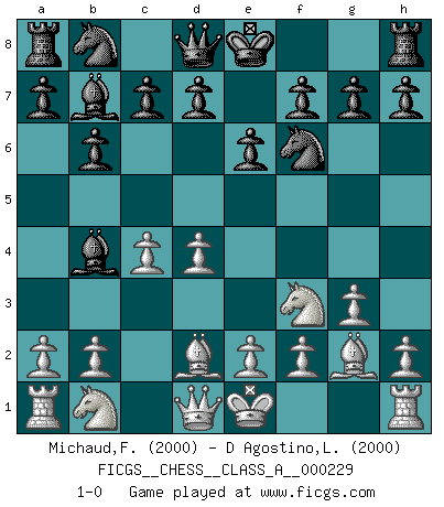 Last move : 1-0 2020 June 22 7:19:31 [Event "FICGS__CHESS__CLASS_A__000229"] [Site "FICGS"] [Date "2020.05.12"] [Round "1"] [White "Michaud,Francois"] [Black "D Agostino,Leonardo"] [Result "1-0"] [WhiteElo "2000"] [BlackElo "2000"] 1.d4 Nf6 2.c4 e6 3.Nf3 b6 4.g3 Bb7 5.Bg2 Bb4+ 6.Bd2 1-0 This chess game has been lost on time (started : 2020.05.12 13:48:31) Queen's Indian : Capablanca variation Player White won this chess game. Follow this game move after move (download)Chess is a matter of delicate judgment, knowing when to punch and how to duck. (Bobby Fischer) Ich erzeugte keinen Neid, da mich die Schachspieler als Musiker und die Musiker als Schachspieler betrachteten. (Mark Taimanov) El Ajedrez hace al hombre ser mas sabio y ver mas claro. (Vladimir Putin) Tous ces prétendus hommes politiques sont les pions, les Cavaliers, les Tours ou les Fous d'une partie d'échecs qui se jouera tant qu'un hasard ne renversera pas l'échiquier. (Honoré de Balzac) Men never do evil so completely and cheerfully as when they do it from religious conviction. (Blaise Pascal)
