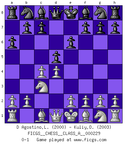Last move : 0-1 2020 June 22 7:19:31 [Event "FICGS__CHESS__CLASS_A__000229"] [Site "FICGS"] [Date "2020.05.12"] [Round "1"] [White "D Agostino,Leonardo"] [Black "Kuliy,Oleksandr"] [Result "0-1"] [WhiteElo "2000"] [BlackElo "2003"] 1.d4 d5 2.c4 e6 3.Nc3 a6 0-1 This chess game has been lost on time (started : 2020.05.12 13:48:31) QGD : Janowski variation Player Black won this chess game. Follow this game move after move (download)Chess is ruthless: you've got to be prepared to kill people. (Nigel Short) Kann Schach nicht schließlich das Nationalspiel der Deutschen werden? Und welche weiteren Ausblicke bieten sich dann dar! Welche Hebung des allgemeinen Kultur-Niveaus, ja der Moral, wenn das Schachbrett den Kartentisch verdrängen würde! Wahrlich, ein Ziel, des Schweißes der Edlen wert! (Siegbert Tarrasch) El Ajedrez era la lengua materna de Capablanca. (Reti) Vous m'avez demandé de vous exposer quel est le fondement de la prière. Je ne fais que préparer les pièces du jeu sur la table... Nous sera-t-il permis d'en adopter les règles et si nous les appliquons scrupuleusement nous ne tarderons pas à faire mat le Roi divin ! Il ne pourra échapper à nos mains. (Sainte Thérèse d'Avila, Chemin de perfection) Just because you do not take an interest in politics doesn't mean politics won't take an interest in you. (Pericles 430 B.C.)