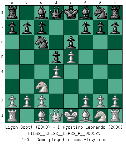 Last move : 1-0 2020 June 22 7:19:31 [Event "FICGS__CHESS__CLASS_A__000229"] [Site "FICGS"] [Date "2020.05.12"] [Round "1"] [White "Ligon,Scott"] [Black "D Agostino,Leonardo"] [Result "1-0"] [WhiteElo "2000"] [BlackElo "2000"] 1.e4 e6 2.d4 d5 3.Nc3 Nc6 4.e5 1-0 This chess game has been lost on time (started : 2020.05.12 13:48:31) French : Paulsen variation Player White won this chess game. Follow this game move after move (download)Examine moves that smite! A good eye for smites is far more important than a knowledge of strategical principles. (Purdy) In Buenos Aires ist es nicht mein vorrangiges Ziel ein starkes Turnier zu organisieren, sondern ein Turnier für Gentlemen. Ich würde nie Kamsky einladen. Ich mag keine Probleme. (Miguel Najdorf) No nos podemos resistir a la fascinación de un sacrificio ya que la pasión por los sacrificios es parte de la naturaleza de un jugador de Ajedrez. (Rudolf Spielman) Karpov est une pièce de musée. (Garry Kasparov) If you ain't just a little scared when you enter a casino, you are either very rich or you haven't studied the games enough. (Pappy)