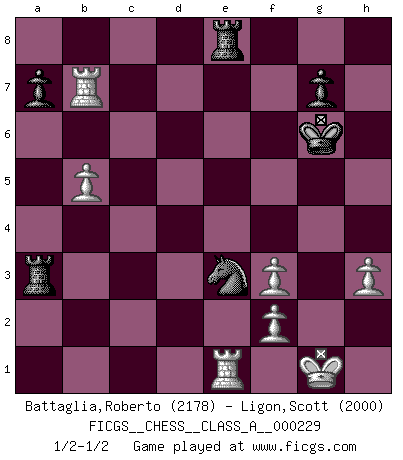Last move : 1/2-1/2 2020 July 3 16:10:14 [Event "FICGS__CHESS__CLASS_A__000229"] [Site "FICGS"] [Date "2020.05.12"] [Round "1"] [White "Battaglia,Roberto"] [Black "Ligon,Scott"] [Result "1/2-1/2"] [WhiteElo "2178"] [BlackElo "2000"] 1.d4 d5 2.c4 e6 3.Nf3 Nf6 4.Nc3 Be7 5.Bf4 O-O 6.e3 c5 7.dxc5 Bxc5 8.cxd5 Nxd5 9.Nxd5 exd5 10.a3 Nc6 11.Bd3 Bb6 12.O-O Bg4 13.h3 Bh5 14.b4 d4 15.b5 Na5 16.exd4 Bxd4 17.Bxh7+ Kxh7 18.Qxd4 Bxf3 19.Qxd8 Rfxd8 20.gxf3 Rd4 21.Be3 Ra4 22.Rfd1 Nc4 23.Rd7 Re8 24.Rxb7 Nxe3 25.Re1 Rxa3 26.Rxf7 Kg6 27.Rb7 1/2-1/2 Queen's gambit declined Kingside Castling by player Black (move 5) Kingside Castling by player White (move 12) This chess game ended in a draw. Follow this game move after move (download)When you don't know what to play, wait for an idea to come into your opponent's mind. You may be sure that idea will be wrong. (Siegbert Tarrasch) Es gibt nur zwei wahre Schachgenies - das andere war Wilhelm Steinitz, der Weltmeister von 1872 bis 1894. (Robert James Fischer) El juego del Ajedrez no es solamente una diversión quieta; algunas cualidades muy valuables de la mente se pueden adquirir y cultivar con el, como convertirlos en habitos disponibles para toda ocasión; ya que la vida es algo así como el Ajedrez. (Benjamin Franklin) Le pion, dans sa simplicité, marche droit devant lui, mais lorsqu'il prend, il le fait obliquement? Ainsi l'homme, tant qu'il reste pauvre, marche dans la droiture et vit honnêtement, mais lorsqu'il recherche les honneurs, il flatte, se parjure et, par les voies obliques, cherche une position supérieure sur l'échiquier du monde. (Jean de Galles) Art is the only way to run away without leaving home. (Twyla Tharp)