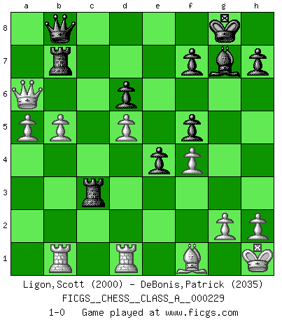 Last move : 1-0 2020 September 11 8:53:58 [Event "FICGS__CHESS__CLASS_A__000229"] [Site "FICGS"] [Date "2020.05.12"] [Round "1"] [White "Ligon,Scott"] [Black "DeBonis,Patrick"] [Result "1-0"] [WhiteElo "2000"] [BlackElo "2035"] 1.e4 c5 2.Nf3 Nc6 3.d4 cxd4 4.Nxd4 Nf6 5.Nc3 e5 6.Ndb5 d6 7.Bg5 a6 8.Na3 b5 9.Bxf6 gxf6 10.Nd5 f5 11.Bd3 Be6 12.O-O Bxd5 13.exd5 Ne7 14.c4 Bg7 15.Rb1 e4 16.Be2 bxc4 17.Nxc4 O-O 18.f3 Rc8 19.b4 Ng6 20.Kh1 Re8 21.f4 Ne7 22.a4 Rb8 23.Qd2 Qd7 24.a5 Qa7 25.Rfd1 Red8 26.Bf1 Rb7 27.Qe2 Qb8 28.Nb6 Nc8 29.Nxc8 Rxc8 30.Qxa6 Rc3 31.b5 1-0 Sicilian : Pelikan (Lasker/Sveshnikov) variation Kingside Castling by player White (move 12) Kingside Castling by player Black (move 17) Player White won this chess game. Follow this game move after move (download)My God, Bobby Fischer plays so simply. (Alexei Suetin) Offensichtlich kennt Kasparow nichts anderes als Schach, und ich könnte 500 weitere Spieler dieser Sorte benennen. (Judith Polgar) Fischer deseaba darle a los Rusos una sopa de su propia medicina. (Larry Evans) Les Echecs représentent une sphère d'idées créatrices basée sur la volonté des deux protagonistes. (Smyslov) Nobody is always a winner, and anybody who says he is, is either a liar or doesn't play poker. (Amarillo Slim)