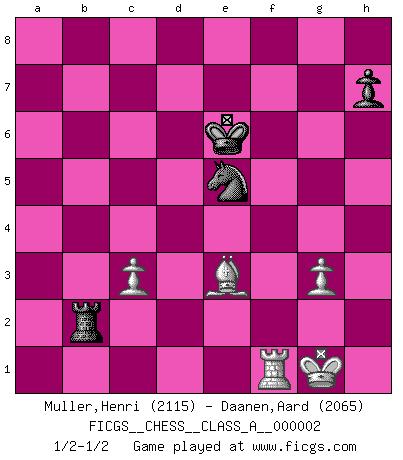 Last move : 1/2-1/2 2006 May 5 2:10:13 [Event "FICGS__CHESS__CLASS_A__000002"] [Site "FICGS"] [Date "2006.04.10"] [Round "1"] [White "Muller,Henri"] [Black "Daanen,Aard"] [Result "1/2-1/2"] [WhiteElo "2115"] [BlackElo "2065"] 1.e4 e5 2.Nf3 Nc6 3.Bb5 a6 4.Ba4 Nf6 5.O-O Be7 6.Re1 b5 7.Bb3 O-O 8.c3 d5 9.exd5 Nxd5 10.Nxe5 Nxe5 11.Rxe5 c6 12.d4 Bd6 13.Re1 Qh4 14.g3 Qh3 15.Be3 Bg4 16.Qd3 Rae8 17.Nd2 Re6 18.a4 f5 19.Qf1 Qh5 20.f4 bxa4 21.Rxa4 Rfe8 22.Qf2 g5 23.fxg5 f4 24.gxf4 Bh3 25.Nc4 Bxf4 26.Ne5 Bxe5 27.dxe5 Rxe5 28.Qg3 Qxg5 29.Rxa6 Qxg3+ 30.hxg3 Be6 31.Bf2 Rxe1+ 32.Bxe1 Nc7 33.Bxe6+ Rxe6 34.Ra1 Re2 35.b4 Nd5 36.Rc1 Rb2 37.Rd1 Kf7 38.b5 Ne7 39.bxc6 Nxc6 40.Bd2 Ne5 41.Rf1+ Ke6 42.Be3 1/2-1/2 Ruy Lopez : Closed, 7...O-O Kingside Castling by player White (move 5) Kingside Castling by player Black (move 7) 10 pieces endgame at move 39 : White KRBPPP , Black KRNP WHITE : King + 1 Rook 1 Bishop 3 Pawns BLACK : King + 1 Rook 1 Knight 1 Pawn 9 pieces endgame at move 39 : White KRBPP , Black KRNP WHITE : King + 1 Rook 1 Bishop 2 Pawns BLACK : King + 1 Rook 1 Knight 1 Pawn This chess game ended in a draw. Follow this game move after move (download)I have always a slight feeling of pity for the man who has no knowledge of Chess. (Siegbert Tarrasch) Dass jemand wie Surab Asmaiparaschwili, der selbst Elopunkte gekauft hat , Vize-Präsident der Fide werden konnte, sagt schon einges über den Zustand dieser Organisation aus. (Joel Lautier) Una buena memoria, concentración, imaginación y una fuerte voluntad, se requiere para llegar a ser un buen jugador. (Bobby Fischer) L'ordinateur a tué l'originalité. Il n'y a plus guère d'aventures sur l'échiquier. (Jacob Murray) The good fighters of old first put themselves beyond the possibility of defeat, and then waited for an opportunity of defeating the enemy. (Sun Tzu)