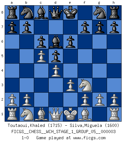 Last move : 1-0 2007 August 20 16:32:2 [Event "FICGS__CHESS__WCH_STAGE_1_GROUP_05__000003"] [Site "FICGS"] [Date "2007.07.11"] [Round "1"] [White "Toutaoui,Khaled"] [Black "Silva,Miguela"] [Result "1-0"] [WhiteElo "1715"] [BlackElo "1600"] 1.Nf3 d5 2.d4 e6 3.c4 c6 4.e3 Bd6 5.c5 1-0 This chess game has been lost on time (started : 2007.07.11 16:54:55) Reti Opening Player White won this chess game. Follow this game move after move (download)A thorough understanding of the typical mating continuations makes the most complicated sacrificial combinations leading up to them not only not difficult, but almost a matter of course. (Siegbert Tarrasch) Schach wird sich dank seiner hohen kulturellen Tradition immer durchsetzen. In näherer Zukunft womöglich sogar als Gegenreaktion auf die maßlose Reizüberflutung im Freizeit- und Spielbereich. (Garry Kasparov) La caracteristica mas importante en la posición del Ajedrez es la actividad de las piezas. Esto es absolutamente fundamental en todas las fases del juego: Apertura, Juego Medio y especialmente Finales. La limitación primordial en la actividad de una pieza, es la estructuración de los Peones. (Michael Stean) La conception d'un plan est le processus par lequel un joueur exploite les avantages de sa position tout en s'efforçant d'en réduire au minimum les inconvénients. Afin de garantir le succès, un plan doit toujours se fonder sur un diagnostic objectif des particularités d'une position. La conception d'un plan est d'autant plus difficile que la position est équilibrée, et grandement facilitée lorsqu'il n'existe qu'un seul plan susceptible de répondre aux exigences de la position. (Harry Golombek) Establishing goals is all right if you don't let them deprive you of interesting detours. (Doug Larson)