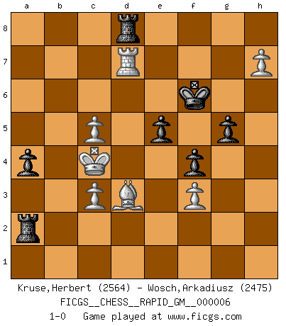 Last move : 1-0 2020 September 2 20:5:3 [Event "FICGS__CHESS__RAPID_GM__000006"] [Site "FICGS"] [Date "2020.05.12"] [Round "1"] [White "Kruse,Herbert"] [Black "Wosch,Arkadiusz"] [Result "1-0"] [WhiteElo "2564"] [BlackElo "2475"] 1.e4 c5 2.Nf3 d6 3.d4 cxd4 4.Nxd4 Nf6 5.Nc3 a6 6.Be3 e5 7.Nb3 Be6 8.f3 Be7 9.Qd2 O-O 10.O-O-O Qc7 11.g4 b5 12.g5 b4 13.gxf6 bxc3 14.Qxc3 Qxc3 15.bxc3 Bxf6 16.Rxd6 Rc8 17.Kd2 Nc6 18.c4 Be7 19.Rd5 f6 20.c3 Nd8 21.h4 Nb7 22.h5 Rc7 23.Bb6 R7c8 24.Bd3 Bf8 25.a4 g6 26.a5 Bd6 27.Bf1 Rab8 28.Bd3 Ra8 29.Bf1 Kg7 30.Be2 Bxd5 31.exd5 Bc5 32.Nxc5 Nxc5 33.h6+ Kf7 34.Rb1 f5 35.Bxc5 Rxc5 36.Rb7+ Kf6 37.Rxh7 Rxa5 38.Rc7 Ra2+ 39.Ke3 f4+ 40.Kd3 a5 41.h7 a4 42.Ra7 Rd8 43.c5 Rxd5+ 44.Kc4 Rd8 45.Bd3 g5 46.Rd7 1-0 Sicilian : Najdorf, Byrne (English) attack Kingside Castling by player Black (move 9) Queenside Castling by player White (move 10) Player White won this chess game. Follow this game move after move (download)Methodical thinking is of more use in Chess than inspiration. (C. J. S. Purdy) Bogoljubow: Matt in vier Zügen! Tartakower: Ich verbitte mir jede Belästigung! (Savielly Grigorievitsch Tartakower) Muchos se han convertido en Maestros de Ajedrez, nadie se ha convertido en el Maestro del Ajedrez. (Siegbert Tarrasch) Les échecs sont plus proches de l'art de l'assassinat que de l'art de la guerre. (Arturo Perez-Reverte) All war is based on deception. (Sun Tzu)