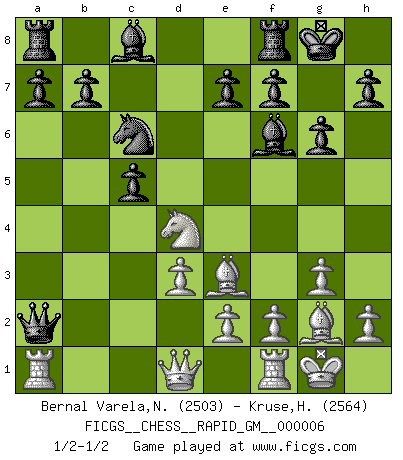 Last move : 1/2-1/2 2020 May 28 23:32:1 [Event "FICGS__CHESS__RAPID_GM__000006"] [Site "FICGS"] [Date "2020.05.12"] [Round "1"] [White "Bernal Varela,Nelson"] [Black "Kruse,Herbert"] [Result "1/2-1/2"] [WhiteElo "2503"] [BlackElo "2564"] 1.Nf3 Nf6 2.c4 c5 3.g3 d5 4.cxd5 Nxd5 5.Bg2 Nc6 6.Nc3 g6 7.O-O Bg7 8.Nxd5 Qxd5 9.d3 O-O 10.Be3 Bxb2 11.Rb1 Bf6 12.Nd4 Qxa2 13.Ra1 1/2-1/2 Reti Opening Kingside Castling by player White (move 7) Kingside Castling by player Black (move 9) This chess game ended in a draw. Follow this game move after move (download)A great player and a great example for many. His book My 60 Memorable Games had a big impact on me. It is a shame he didn't continue to enrich the world of chess with his unparalleled understanding after 1972. (Jan Timman, about Bobby Fischer's death) Nach Morphy wurde nichts neues mehr in der Behandlung offener Positionen gefunden. (Mikhail Moiseyevich Botvinik) Las combinaciones han sido siempre el aspecto más intrigante del Ajedrez. Los Maestros las buscan, el público las aplauden, los críticos las alaban. La razón se debe a que las combinaciones hacen posible que el Ajedrez sea más que un ejercicio matemático con una carencia de vida. Ellas son la poesía del juego, son del Ajedrez lo que la melodía es de la música. Ellas representan el triunfo de la mente sobre la materia. (Reuben Fine) Nous sommes les pions de la mystérieuse partie d'Echecs jouée par Dieu. Il nous déplace, nous arrête, nous pousse encore, puis nous lance un à un dans la boîte du Néant. Epitaphe sur la tombe de David Janowsky (1868-1927). I have opinions of my own - strong opinions - but I don't always agree with them. (George Bush)