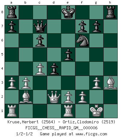 Last move : 1/2-1/2 2020 June 3 13:24:55 [Event "FICGS__CHESS__RAPID_GM__000006"] [Site "FICGS"] [Date "2020.05.12"] [Round "1"] [White "Kruse,Herbert"] [Black "Ortiz,Clodomiro"] [Result "1/2-1/2"] [WhiteElo "2564"] [BlackElo "2519"] 1.Nf3 Nf6 2.g3 c5 3.b3 Nc6 4.Bb2 d5 5.Bg2 Qc7 6.d4 cxd4 7.Nxd4 e5 8.Nxc6 bxc6 9.O-O h5 10.c4 d4 11.Re1 Bb4 12.Nd2 h4 13.a3 hxg3 14.hxg3 Bxd2 15.Qxd2 Bh3 16.Bxh3 1/2-1/2 Reti Opening Kingside Castling by player White (move 9) This chess game ended in a draw. Follow this game move after move (download)On the chessboard, lies and hypocrisy do not survive long. (Emanuel Lasker) Ohne Leiden bildet sich kein Charakter. (Ernst Freiherr von Feuchtersleben) Todavía soy una víctima del Ajedrez. Tiene toda la belleza del arte y mucho mas. No puede ser comercializado. El Ajedrez es mas puro que el arte en su posición social. (Marcel Duchamp) On a dit que l'homme se distingue de l'animal par le fait qu'il achète plus de livres qu'il ne peut en lire. Je voudrais suggérer qu'inclure à la liste des livres quelques livres d'échecs rendrait la distinction manifeste. (Edward Lasker) Depression is just anger without enthusiasm. (Unknown)