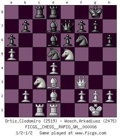 Last move : 1/2-1/2 2020 June 28 17:39:32 [Event "FICGS__CHESS__RAPID_GM__000006"] [Site "FICGS"] [Date "2020.05.12"] [Round "1"] [White "Ortiz,Clodomiro"] [Black "Wosch,Arkadiusz"] [Result "1/2-1/2"] [WhiteElo "2519"] [BlackElo "2475"] 1.d4 Nf6 2.c4 e6 3.Nf3 d5 4.Nc3 c6 5.e3 Nbd7 6.Qc2 Bd6 7.Bd3 O-O 8.O-O dxc4 9.Bxc4 a6 10.a4 c5 11.Rd1 cxd4 12.exd4 Qc7 13.Qe2 Re8 14.Be3 h6 15.Rac1 Nb6 16.Bd3 Qe7 17.Ne5 Bd7 18.a5 Nbd5 19.Bd2 Rac8 20.Qf3 Red8 21.Qg3 Kf8 22.Qf3 Kg8 23.Qg3 Nh5 24.Qf3 Nhf6 1/2-1/2 Queen's pawn game Kingside Castling by player Black (move 7) Kingside Castling by player White (move 8) This chess game ended in a draw. Follow this game move after move (download)A good sacrifice is one that is not necessarily sound but leaves your opponent dazed and confused. (Rudolph Spielmann) Ihnen, Herr Lasker, habe ich nur drei Worte zu sagen: Schach und matt. (Siegbert Tarrasch) Coloca el contenido del tablero de Ajedrez en un sombrero, agita las piezas vigorosamente, derrámalas en el tablero desde una altura de medio metro y así obtienes el estilo de Wilhelm Steinitz. (H. E. Bird) Tous ces prétendus hommes politiques sont les pions, les Cavaliers, les Tours ou les Fous d'une partie d'échecs qui se jouera tant qu'un hasard ne renversera pas l'échiquier. (Honoré de Balzac) Fortune favours the audacious. (Desiderius Erasmus)